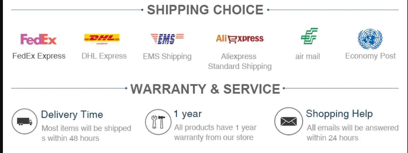 1. Гарантия 1 год (надежность с даты покупки) 2. Мы не можем принять возврат средств без проблем с качеством. Если товар имеет проблемы с качеством, пожалуйста, свяжитесь с нами в течение 3 рабочих дней с даты получения посылки. 3. Пожалуйста, храните возвращаемые товары в качестве оригинальной посылка, и доставка с номером отслеживания. 4. Пожалуйста, укажите свой Aliexpress ID, адрес, номер телефона, способ оплаты и вашу проблему в бумаге с возвратом товара. 5. За дополнительную плату и доставку, ответственность покупателя.