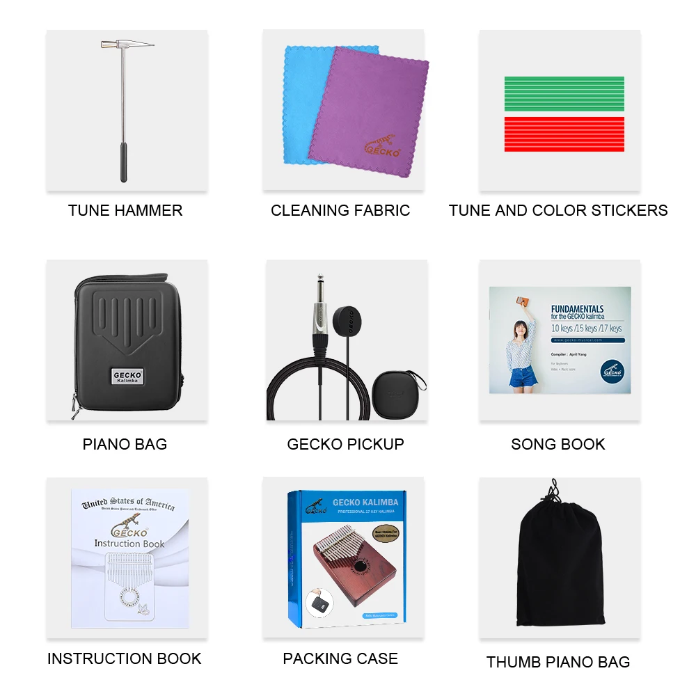 Тип товара: калимба Цвет: натуральный Бренд: GECKO Размер: 32*130*185 мм Материал: корпус-Массив дерева красного дерева, ключ-углеродистая сталь Посылка включает: -- Калимба -- Тюнинговый молоток -- Ткань для очистки -- Цветные наклейки -- Сумка для пианино -- Songbook -- Инструкция по эксплуатации -- Сумка из ЭВА -- Gecko пикап Примечание: Тон был скорректирован на фабрике, но из-за ударов и изменения климата на дороге, клиентам, возможно, придется немного отрегулировать тон.