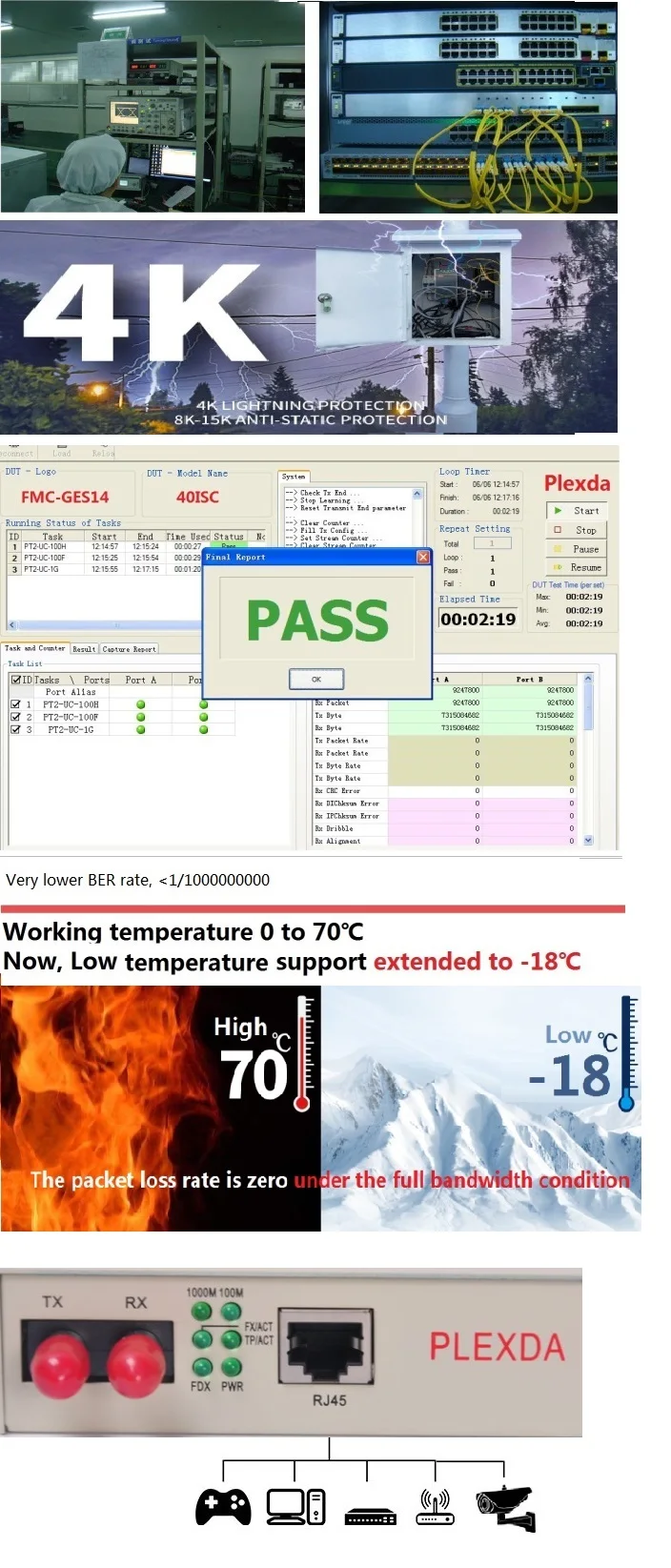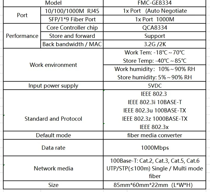 Поддерживает 10/100/1000Base-Tx и 1000Base-X приложений. Сигнал передачи данных, Преобразованный таким высокопроизводительным медиаконвертером, может быть передан до 100 км максимум с помощью одномодового 9/125um волоконно-оптического кабеля от RJ45 Cooper Cat.5 сетевой кабель (зависит от оптического модуля).