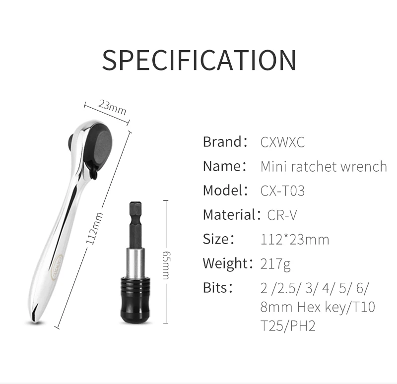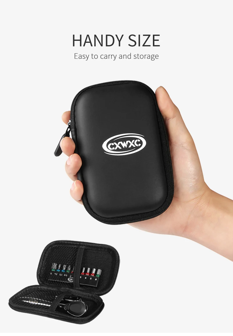 Модель: CX-T03 Размер мешочка: 8,5X13,5 см Посылка входит: ручка CR-V X 1; Биты: 2 мм/2,5 мм/3 мм/4 мм/5 мм/6 мм/8 мм/T10 /T25 /PH2; Удлинительный адаптер 65 мм.