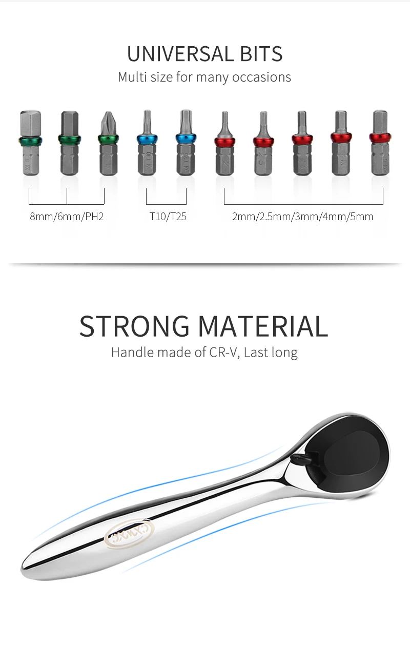Надежная и долговечная-ручка из высококачественной нержавеющей стали с реверсивным приводом Многофункциональный набор инструментов 10 в 1 позволяет использовать его во многих случаях. Удобный размер сумки-легко носить с собой и хранить