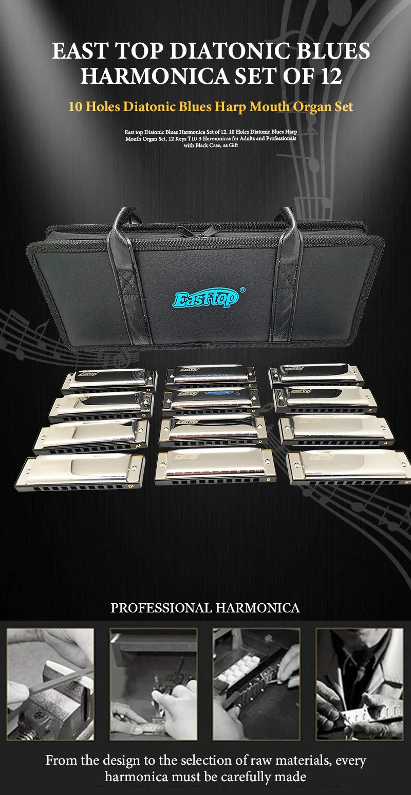 EASTTOP T10-3-12 10 отверстий диатонической Blues набор губных гармоник 12 Ключи для взрослых и профессионалов с черный Чехол