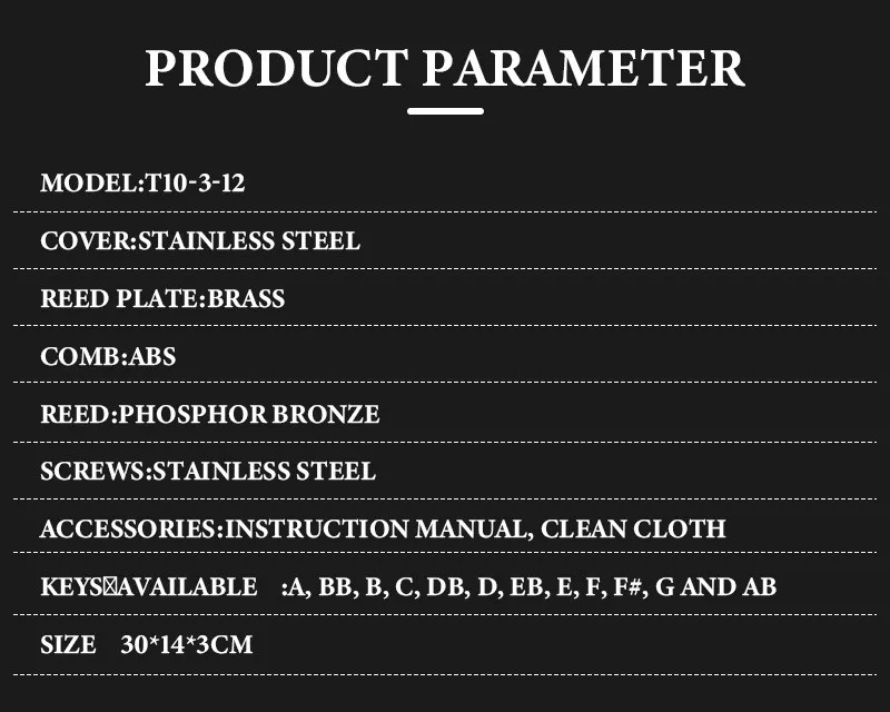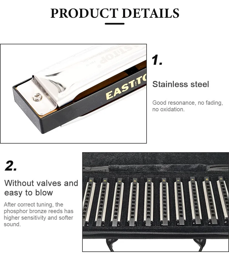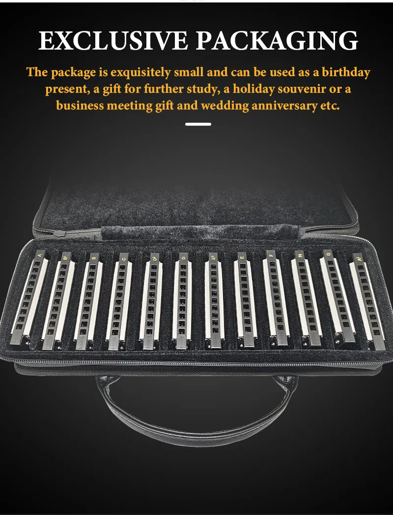 Посылка включает в себя 12 ключей гармоник, упакованных в одну холщовую сумку, A, Bb, B, C, Db, D, Eb, E, F, F #, G и Ab ключ. Мы являемся производителем harmonica от ведущего бренда East. Поддерживаются East top 30 дней безусловной возврата денег. Вы можете быть уверены в покупке нашей продукции.