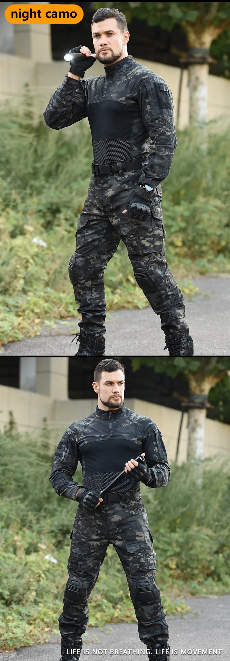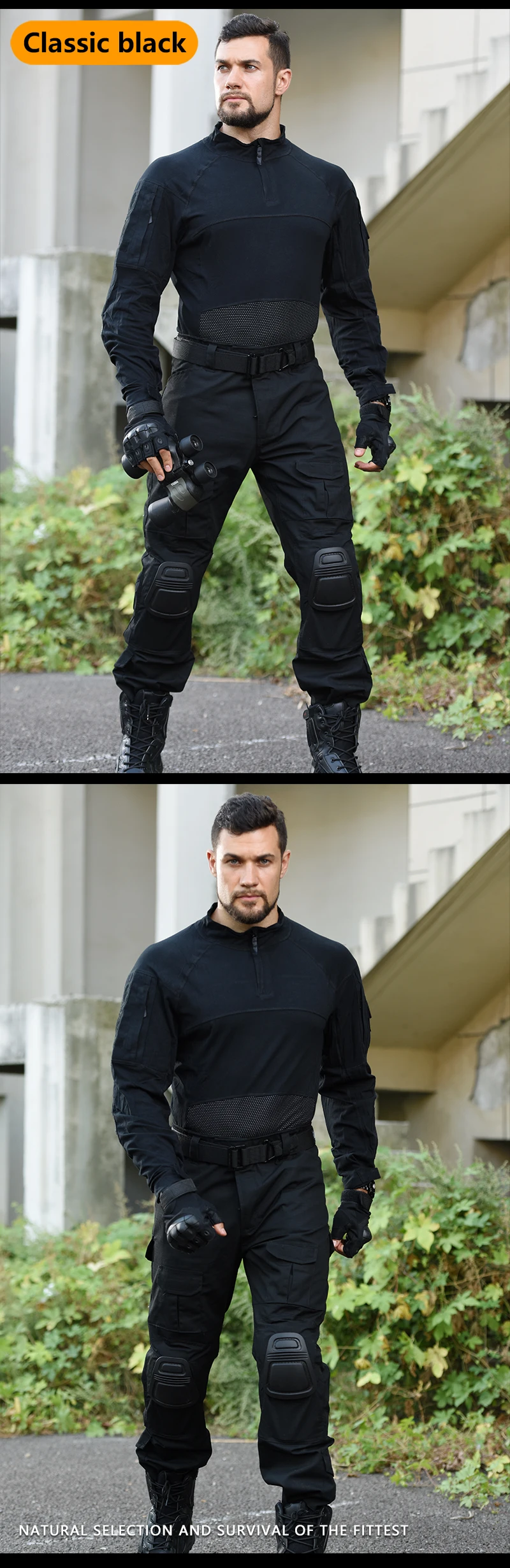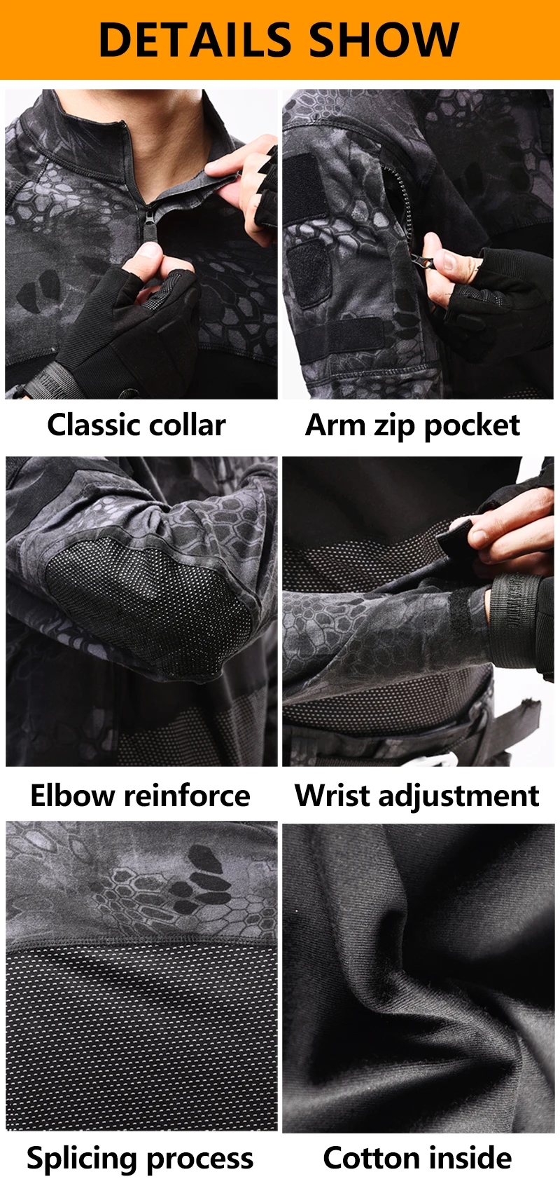 Материал:95% хлопок + 5% полиэстер Рубашки: 1: регулируемый манжет с крючком и петлей 2: 2 кармана с молниями на рукавах 3: высокоэластичная ткань, очень мягкая и дышащая 4: быстрая сушка и легко моется 5: двухслойная ткань на локотьБрюки: