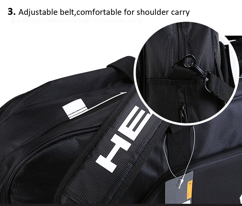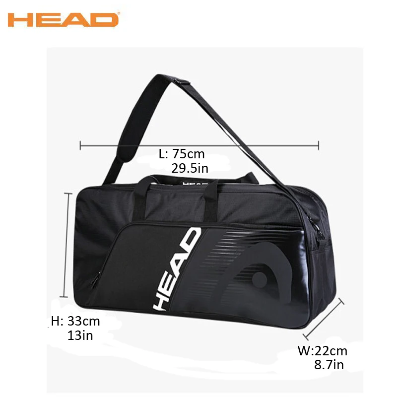 Specifications:Product name: HEAD tennis badminton bagMaterial: Polyester + PUColor: BlackSize: 75*33*22cm (29.5*13*8.7in)Model: 2180210-9000Weight: 1.5KGCapacity: 3-6 tennis rackets, 6-9 badminton rackets, clothing, shoes, etc.Use: Sports, Touring, Sports Training Bag, TravelKeywords: HEAD Black Sports Tennis Rackets Bag