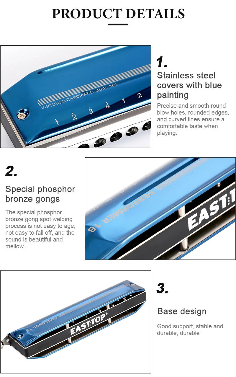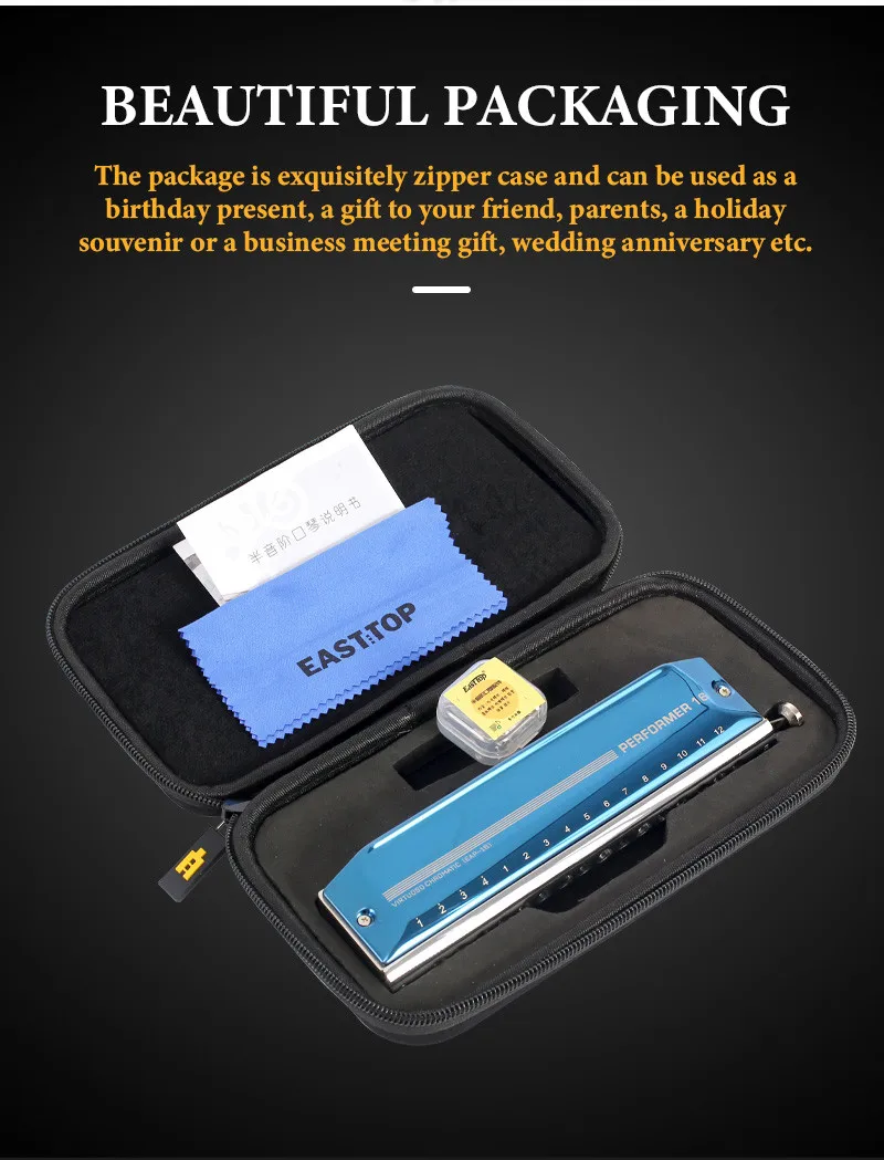 Новый Стандартный в качественное мастерство и возможность воспроизведения-исполнитель EASTTOP'S Профессиональный соло настроены ABS гребень Хроматическая гармошка комплекс 3-трехоктавой диапазоне глядя на средний C. Хроматическая гармоника фосфорная бронзовая трость профилирована для ведущей в отрасли реакции и долговечности. Специальные ветрозащитные клапаны и конструкция ABS гребня гарантируют лидирующую в отрасли реакцию и звуковую проекцию по всему диапазону.