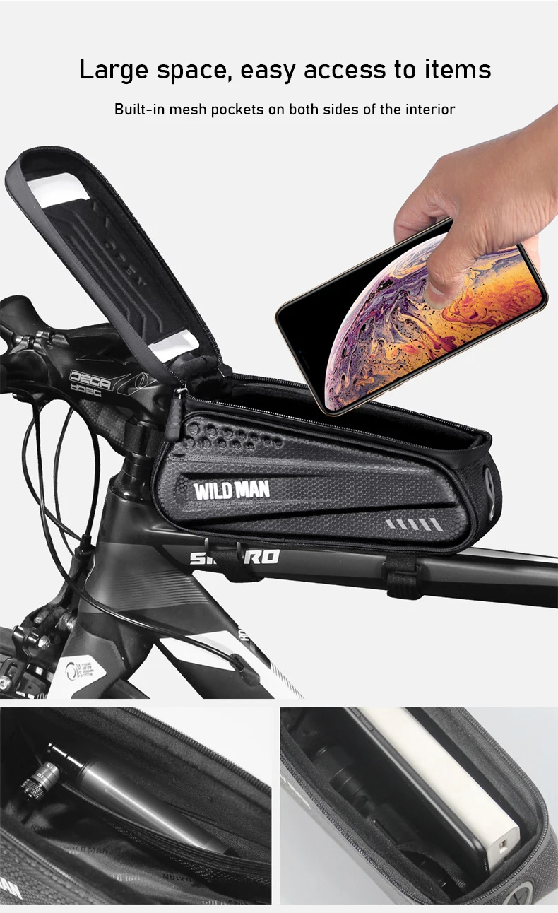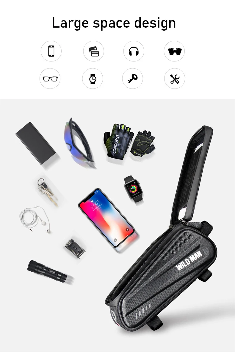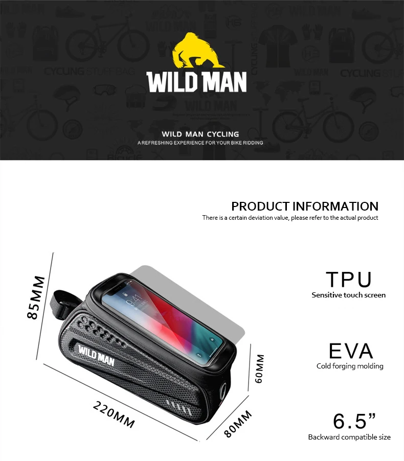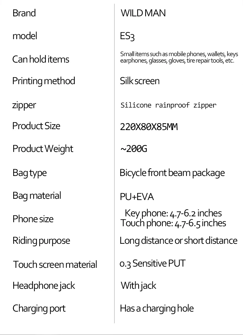 Бренд: WILD MAN, Модель: ES3, может держать предметы: мелкие предметы, такие как мобильные телефоны, кошельки, наушники с ключами, очки, перчатки, инструменты для ремонта шин и т. д. Способ печати: Шелковый экран, молния: Силиконовая непромокаемая молния, размер изделия: 220x80x85мм, вес изделия: ~ 200 г сумка Тип: велосипедная Передняя балка посылка, сумка Материал: искусственная кожа + этиленвинилацетат (ЭВА), Размер телефона: с брелком-позвоните по телефону: 4,7-6,2 дюймов сенсорный экран телефона: 4,7-6,5 дюйма, езда назначение: большое расстояние или короткое расстояние, материал сенсорного экрана: 0,3 чувствительный, разъем для наушников: с разъемом, порт зарядки: имеет отверстие для зарядки