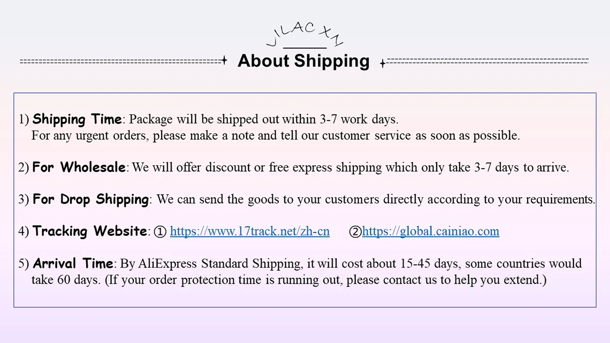 По AliExpress стандартной доставки, это будет стоить около 10-45 дней, некоторые страны займет 60 дней. (Если время защиты вашего заказа истекает, пожалуйста, свяжитесь с нами, чтобы помочь Вам продлить.)