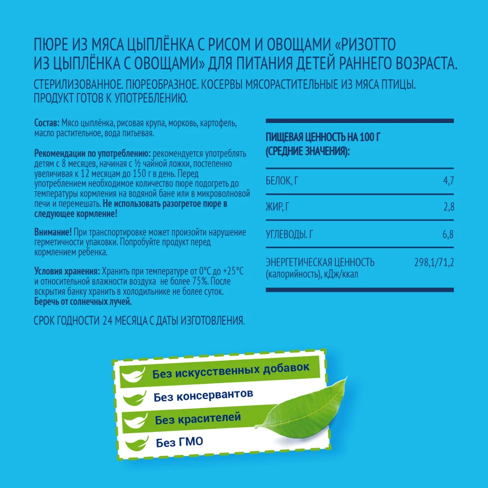 Рекомендации по употреблению: Рекомендуется детям с 6 месяцев, начиная с 1/2 чайной ложки постепенно увеличивая к 12 месяцам до 60-70 грамм в день. Перед употреблением необходимое количество пюре подогреть до температуры кормления на водяной бане или в микроволновой печи и перемешать. Не использовать разогретое пюре в следующее кормление! Не используйте продукт, если при открытии крышки не произошло щелчка!
