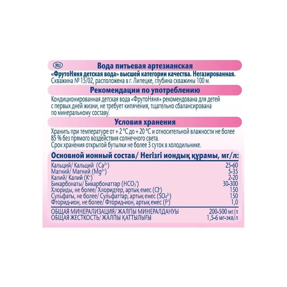 Детская вода «ФрутоНяня» рекомендована для детей с первых дней жизни, не требует кипячения, тщательно сбалансирована по минеральному составу.
