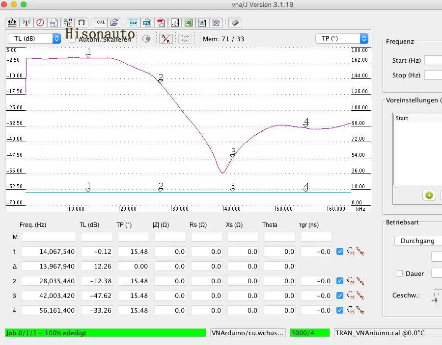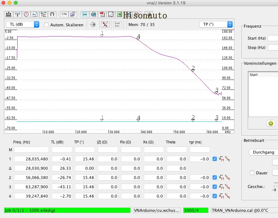 На следующих схемах показана потеря передачи 4 фильтров с низким проходом. Он был измерен с помощью YanaVNA-BT и визуализирован с помощью программы VNAJ. Маркеры на диаграмме настроены на следующие частоты: Маркер 1: старт SW band Маркер 2: старт SW band * 2 Маркер 3: старт SW band * 3 Маркер 4: старт SW band * 5 Если иное не установлено в более высоком частотном диапазоне, потому что используемое измерительное устройство YanaVNA-BT работает только до 65 МГц.