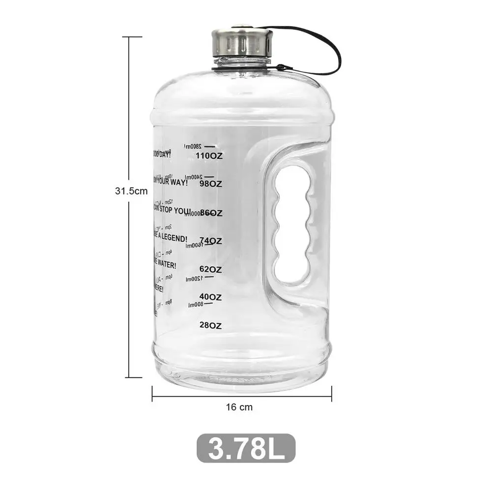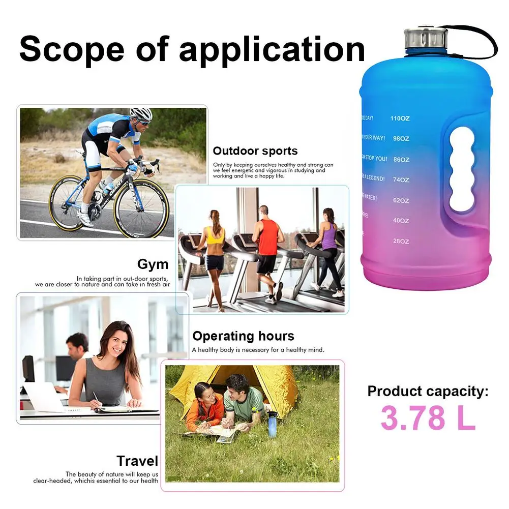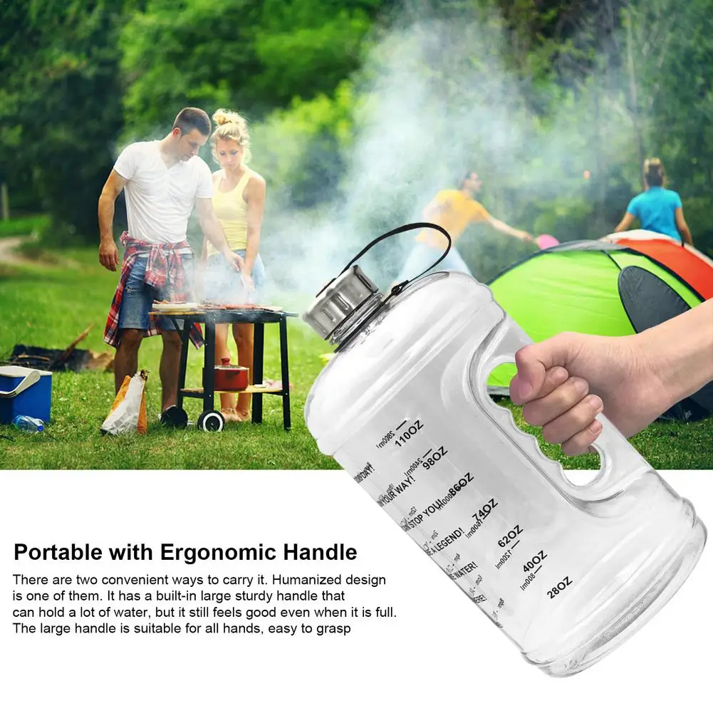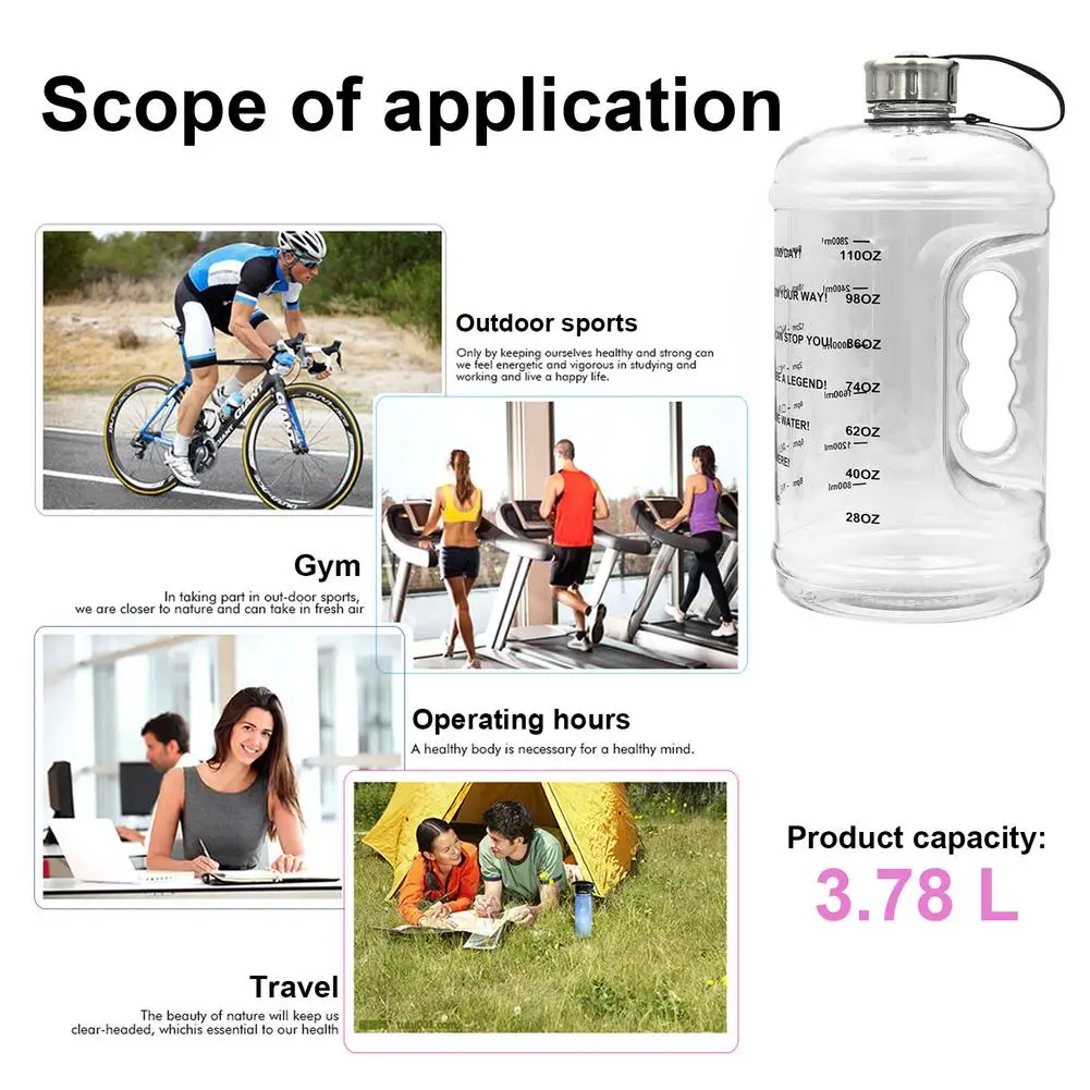 1. Многофункциональный чайник: Большая емкость 1 галлон, легко моется и заполняется широким ртом, Пыленепроницаемая и герметичная крышка плотно уплотняет, время и мощность маркировки/дозирования чайник, эргономичная портативная ручка. Широко используется для велоспорта, кемпинга, бега, фитнеса, путешествий, пикников, потери веса и увлажнения в течение дня.