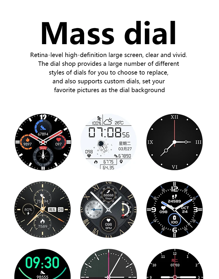 В часах есть циферблаты, также он поддерживает настройку циферблата часов с вашего телефонного альбома.