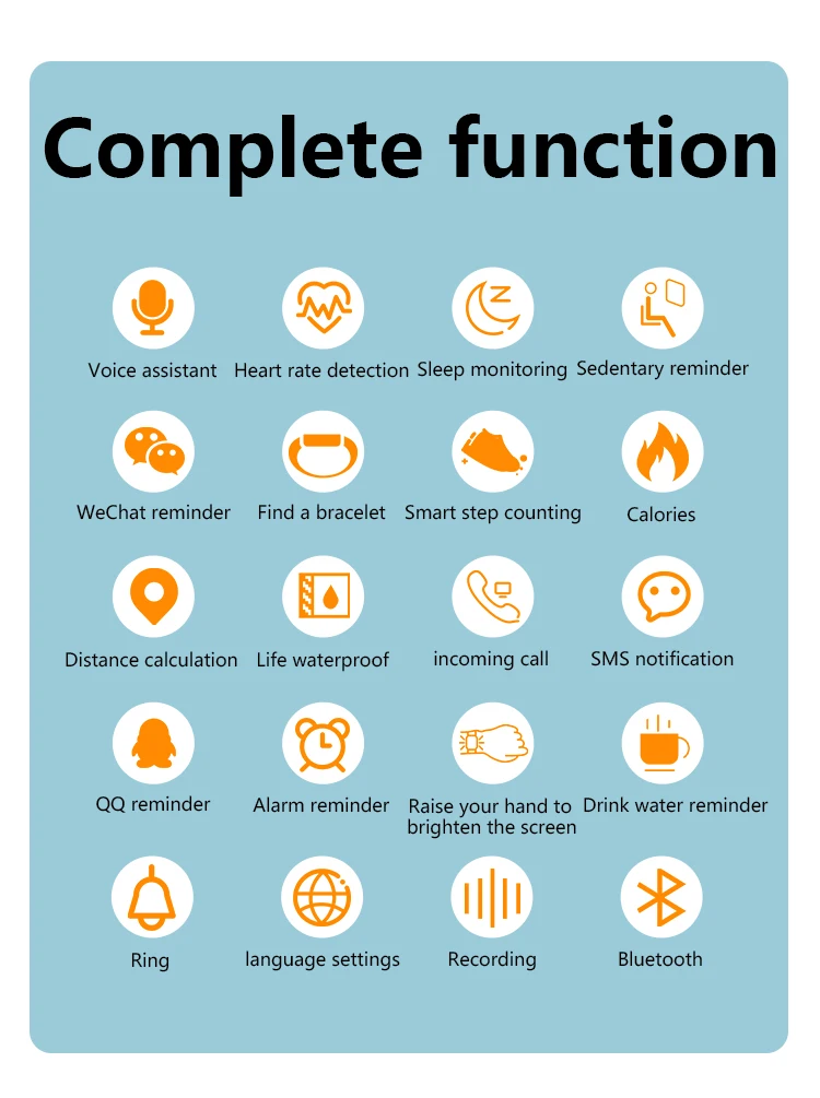 Пошаговый подсчет, мониторинг сна, пульс, кровяное давление, кислород в крови, напоминание о сидячем положении, напоминание о питье.