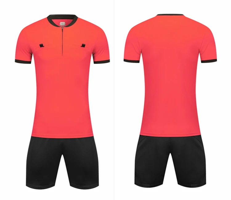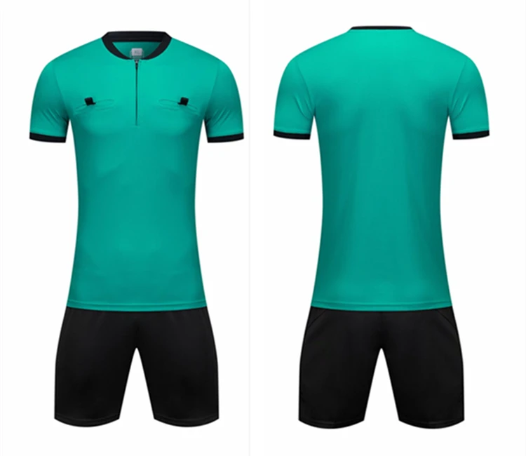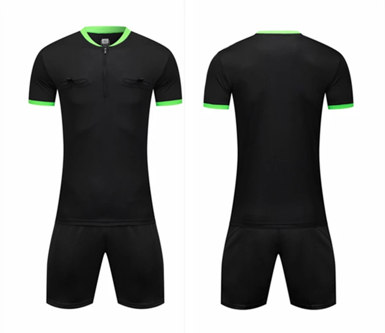 Высококачественная форма футбольного рефери, рубашка с короткими рукавами и полумолнией с двойными передними карманами и шорты с тремя карманами. 100% полиэфирная ткань, мягкая и удобная, дышащая, быстросохнущая.