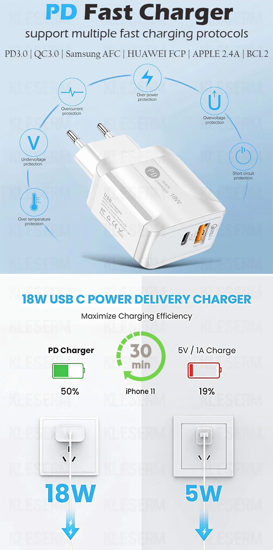Зарядка iPhone 12 от 0% до 50% за 30 минут Поддержка нескольких протоколов быстрой зарядки PD3.0 / PD2.0 / QC3.0 / QC2.0 / Samsung AFC / HUAWEI FCP / APPLE 2.4A / BC1.2