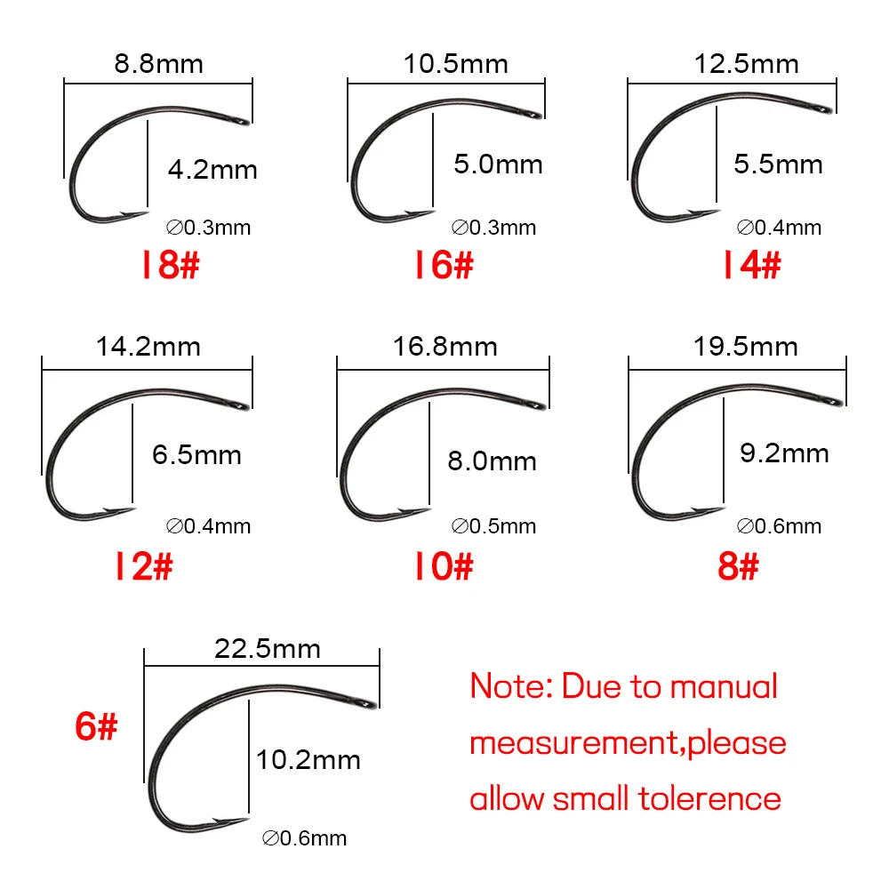 Bimoo 100 шт. изогнутый крючок из высокоуглеродистой стали для завязывания мух для эмергеров Caddis Pupas, калек и сухих мушек в стиле Klinkhammer #6-#18
