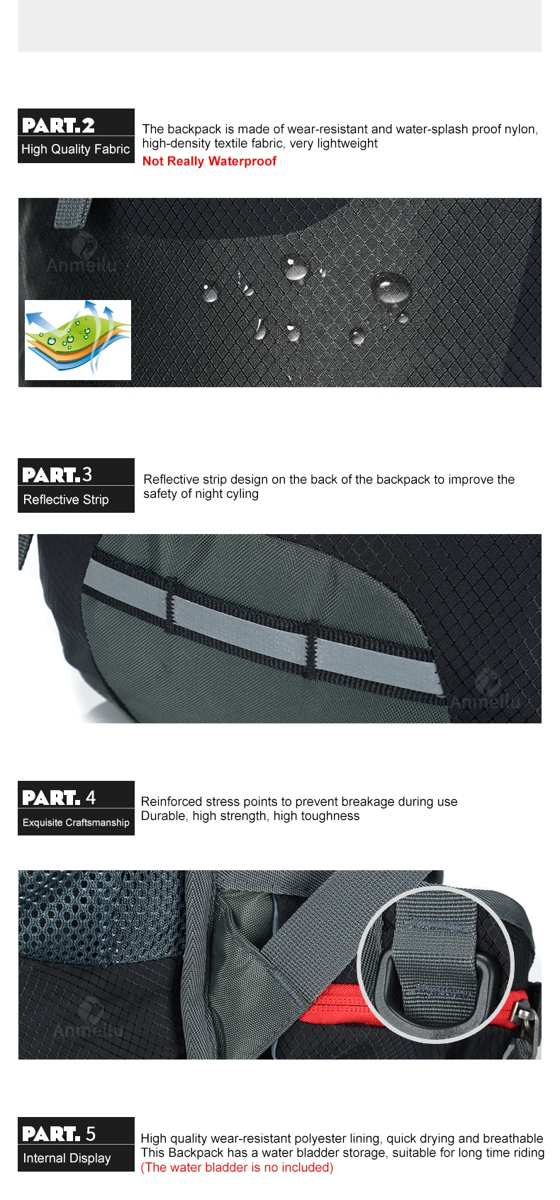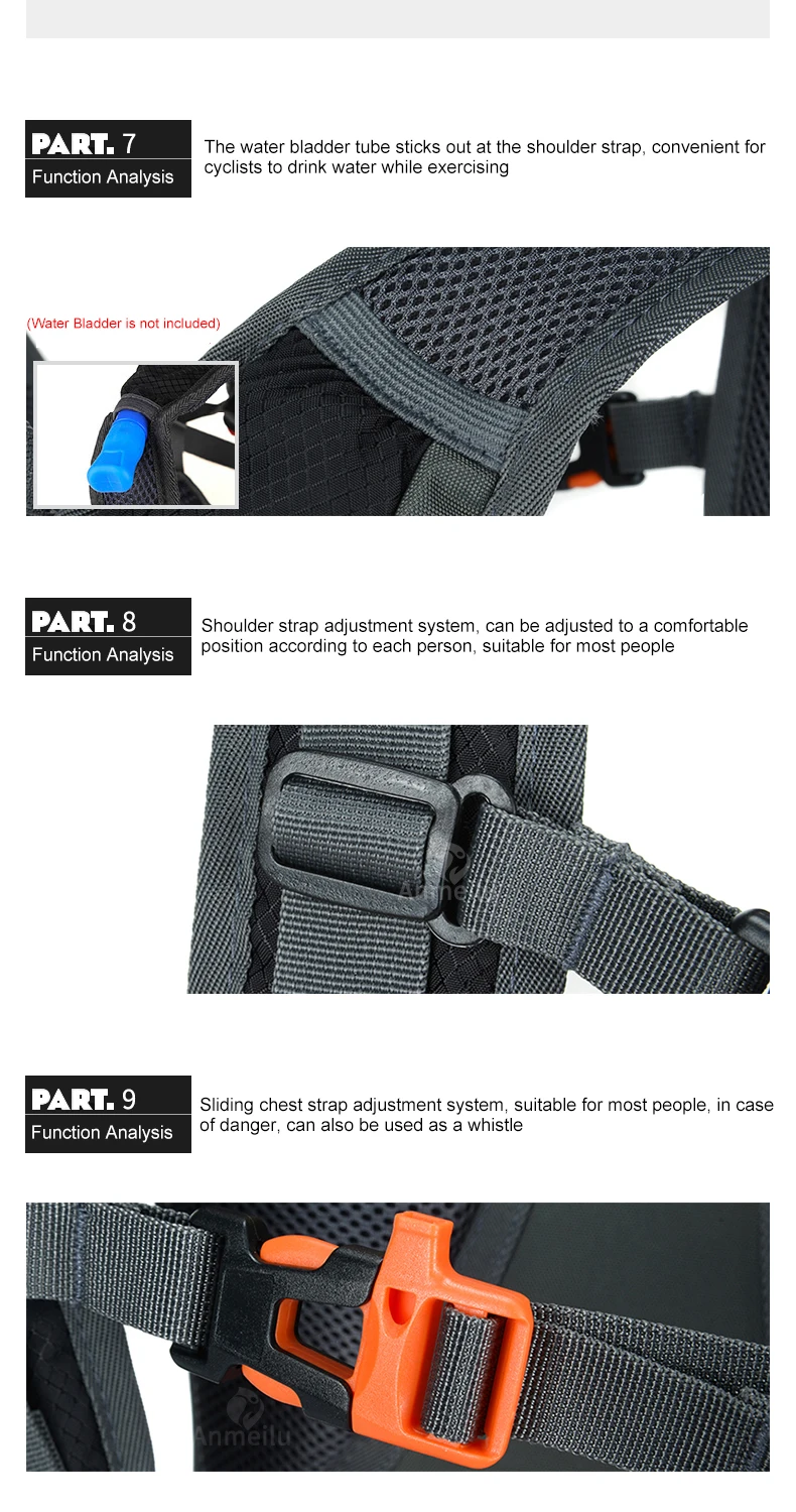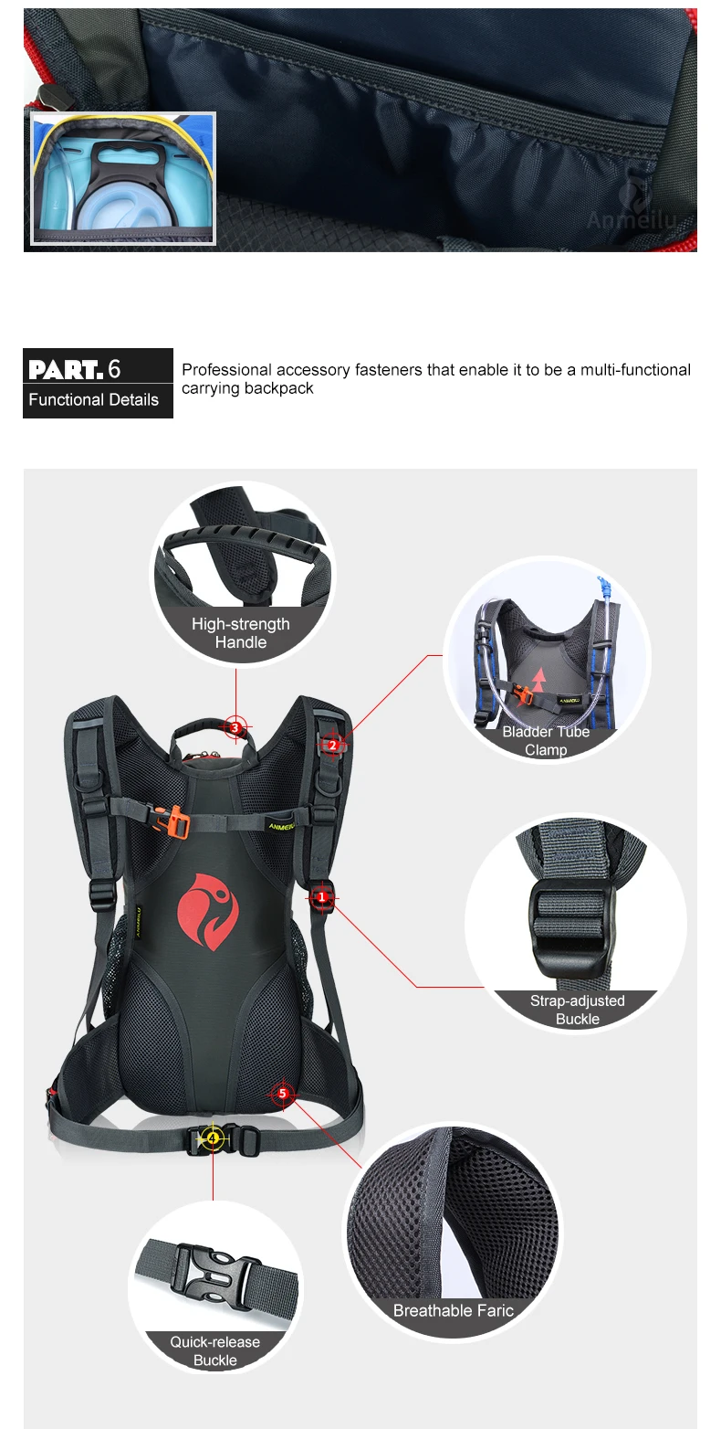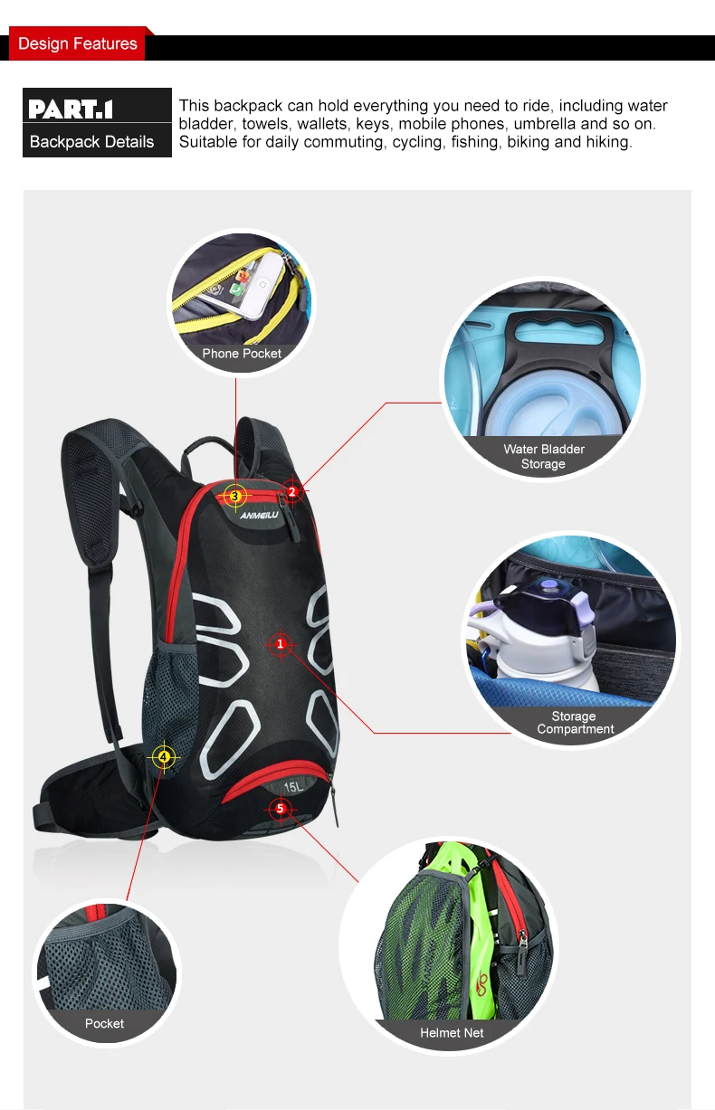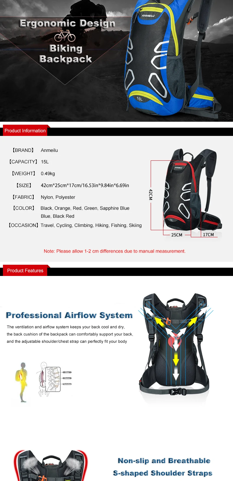 Это 15 литров велосипеда рюкзак может вместить все, что вам нужно для езды, включая воду, мочевого пузыря, полотенца, кошельки, ключи, мобильные телефоны, одежда с рисунками зонтиков и так далее. Подходит для ежедневных поездок, езды на велосипеде и пеших прогулок. Сетчатый и пористый EVA дизайн на задней части велосипедного рюкзака для максимальной воздухопроницаемости и рассеивания тепла. Таким образом, задний воздух может свободно циркулировать во время вождения, высушивая заднюю часть и предотвращая попадание пота в сумку. Для освобождения нагрузки на путешествия, этот рюкзак изготовлен из легкой водонепроницаемой нейлоновой ткани, что делает общий вес рюкзака всего 490 г. Сетчатый плечевой ремень с обильной губчатой подкладкой имеет дугообразную форму и эргономичную конструкцию и может снять напряжение с плеча и шеи. Регулируемый нагрудный ремень и поясной ремень можно зафиксировать сумку, чтобы сумка не отскакивала во время езды на велосипеде. Плечевые ремни этого велосипедного рюкзака имеют скрытый канал для гидратации мочевого пузыря. Увлажнение чехол устанавливается на верхней части основное отделение и полностью совместим с большинством 2 л воды мочевого пузыря на рынке. Легко для питьевой воды во время езды на велосипеде.
