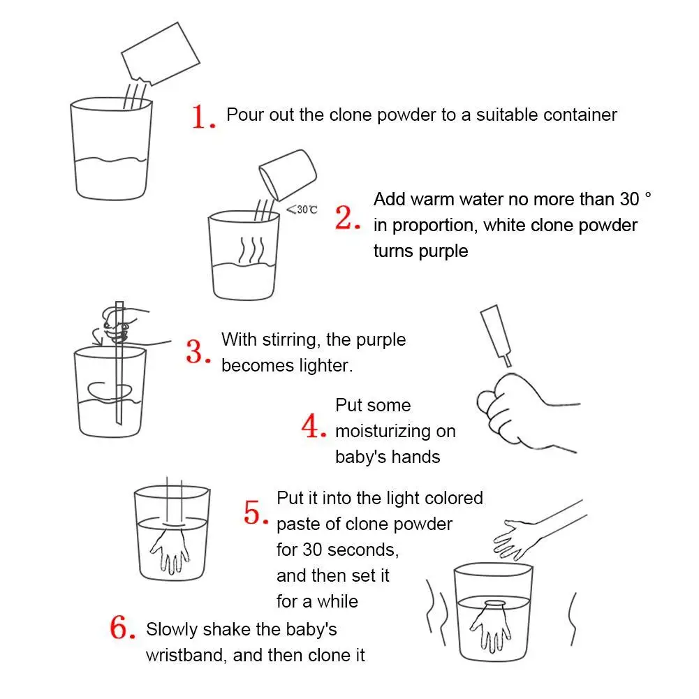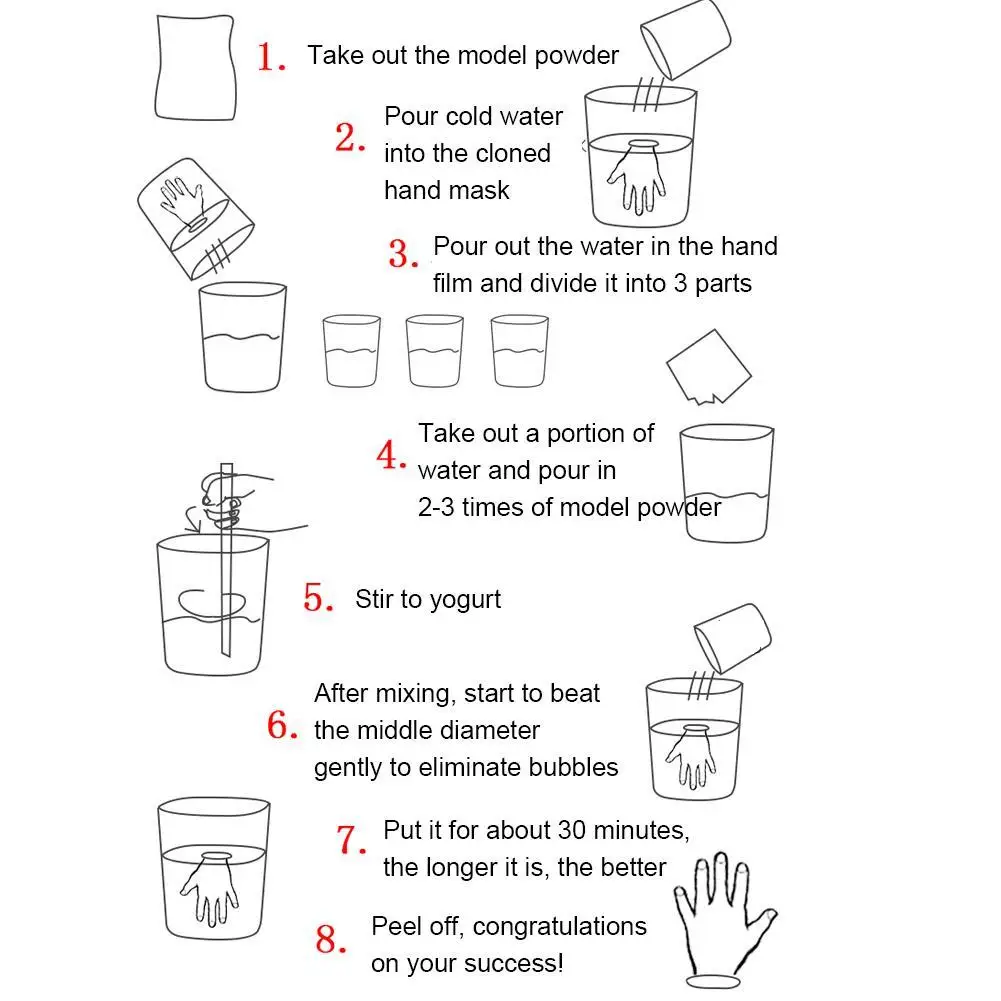 Порошок для литья смешивается с водой. После установки формы около 75 секунд нога или рука ребенка помещаются в литой контейнер. Откачивайте ноги ребенка (или руки) из формовочного материала.