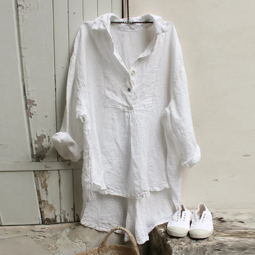 Повседневная Однотонная рубашка 2022 Весенняя женская Асимметричная блуза на пуговицах Модная хлопковая льняная розовая туника с отворотом и длинными рукавами