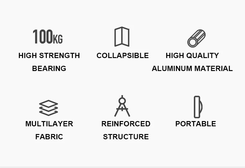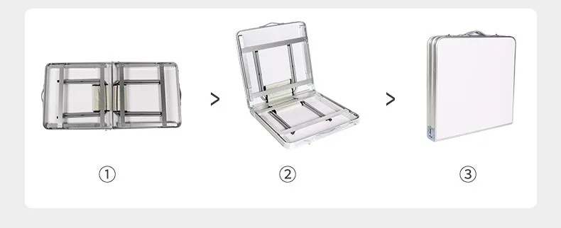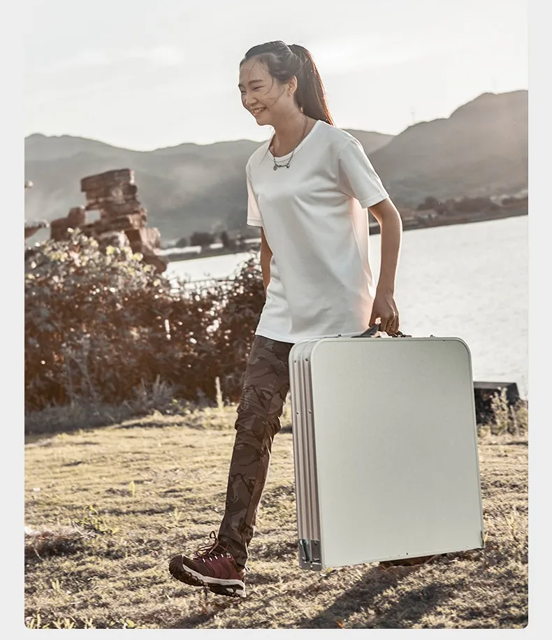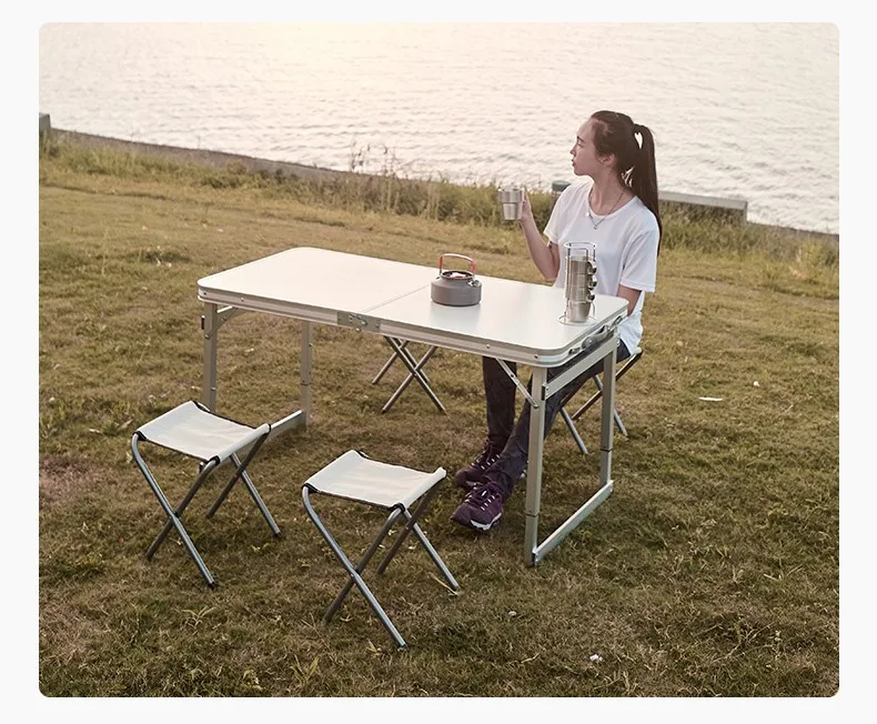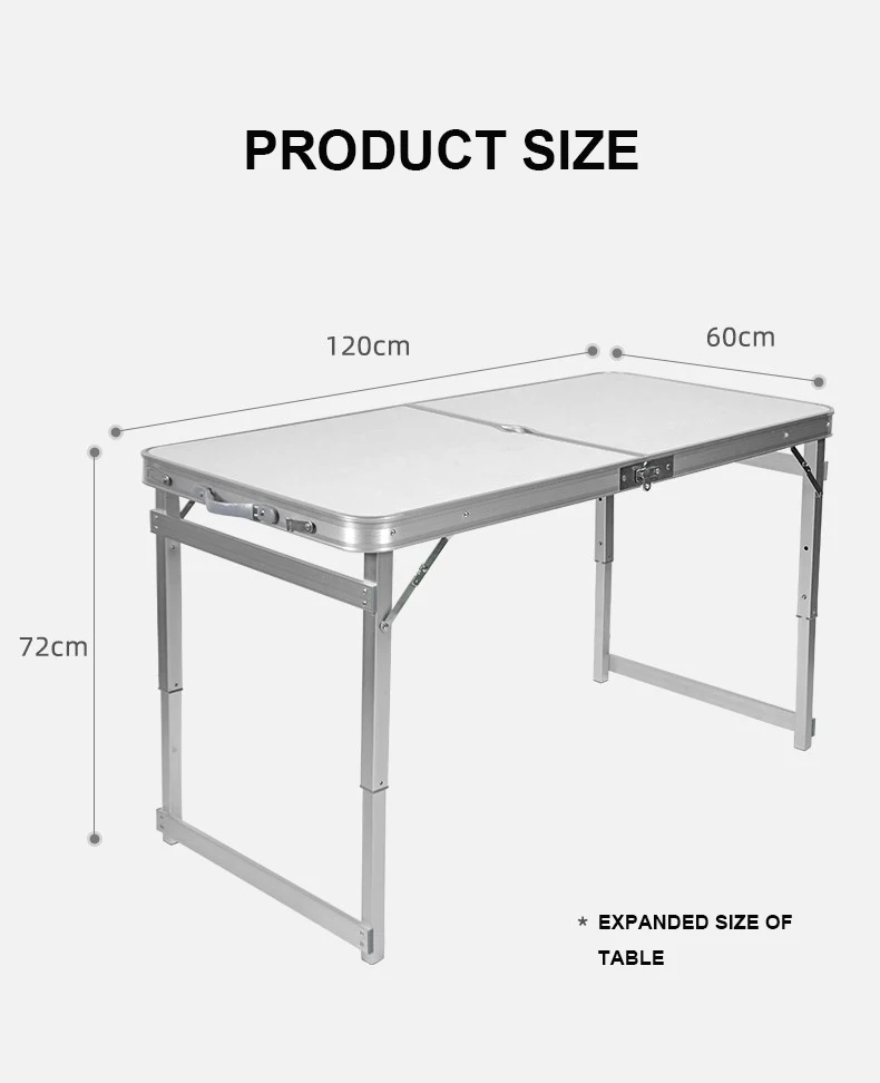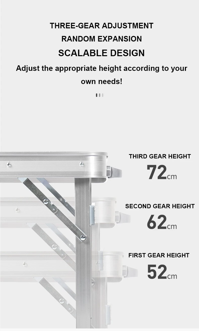 Складные ножки стола изготовлены из алюминиевого сплава, высоту можно регулировать по желанию в 3 положениях. Армированные железные крепления, треугольная Пряжка, соответствующая механическому принципу, и u-образная конструкция между двумя ножками стола делают складной стол намного более устойчивым.