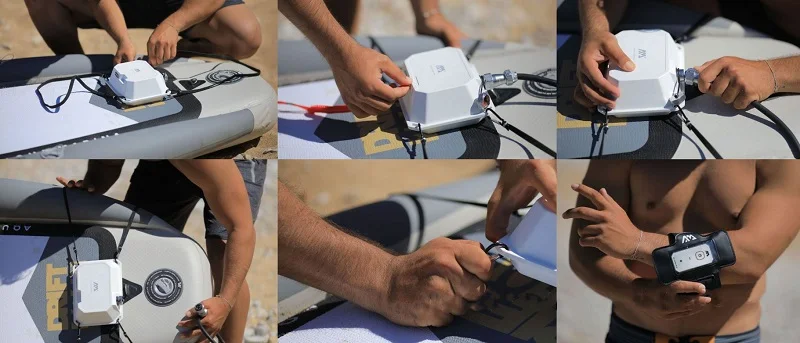 Блок питания подключен к пользователю с поводком для автоматического отключения для предотвращения бега, если вы падаете в воду.