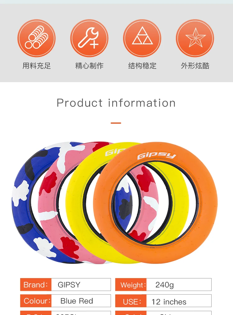 Бренд: GipsyModel: ia2886размер: 12*1.75 Вес: 240 г ± 10 г (черный 190 г ± 10 г) цвета: красный/OrangeTPI : 60 Происхождение: китайский материал: резина Максимальное давление: 60 PSI