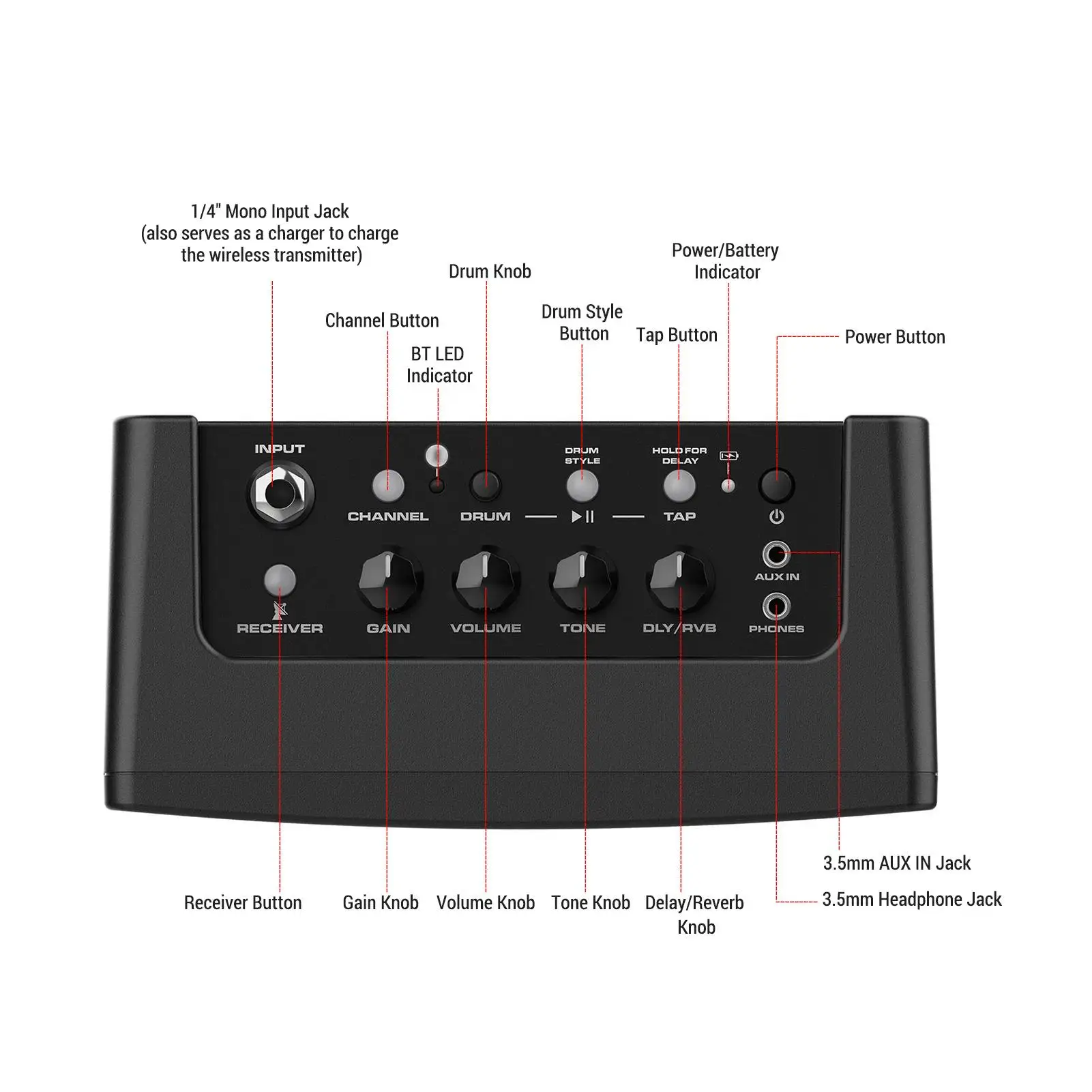 Входной разъем: 1/4 дюйма моно (также служит зарядным устройством для зарядки беспроводного передатчика)