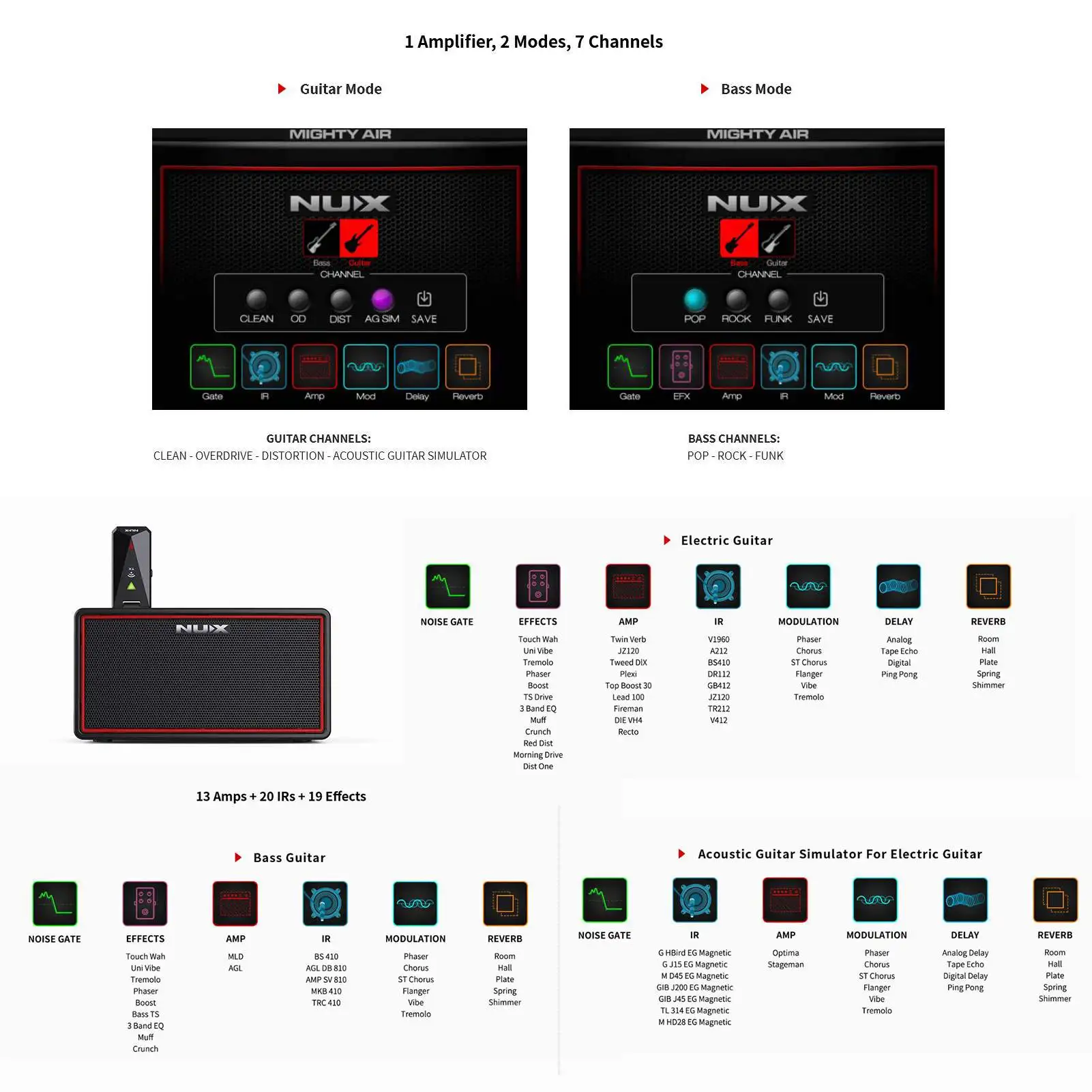 1 усилитель и 2 режима и 7 каналов: NUX Mighty Air беспроводной стерео усилитель поддерживает режим гитары и режим басов. Гитарный режим имеет 4 канала (чист-овердрайв-искажение-Акустический Гитарный симулятор), а басовый режим имеет 3 канала (поп-рок-фанк).