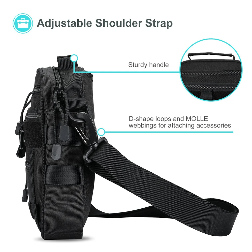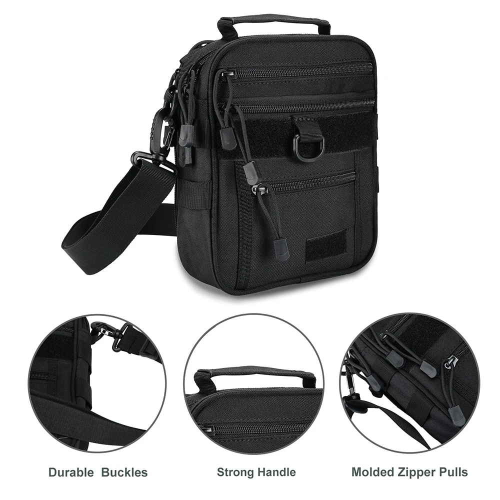 4. Прочная ручка и регулируемый плечевой ремень для переноски; D-образные петли и Молле лямки для крепления аксессуаров.
