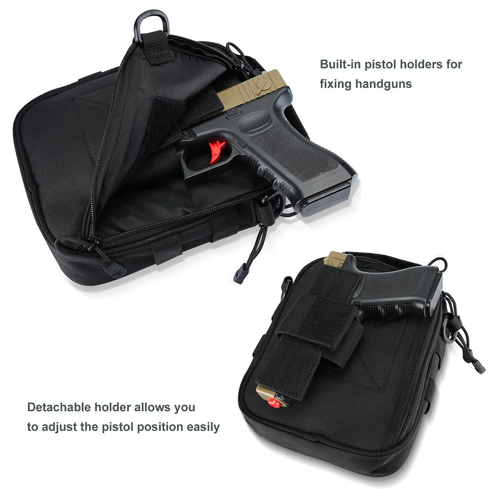 1. Большая емкость: 9x7 дюймов; Достаточно для хранения пистолета, журналов, боеприпасов, снаряжения для дробовика, аксессуаров для дальности действия и т. д.