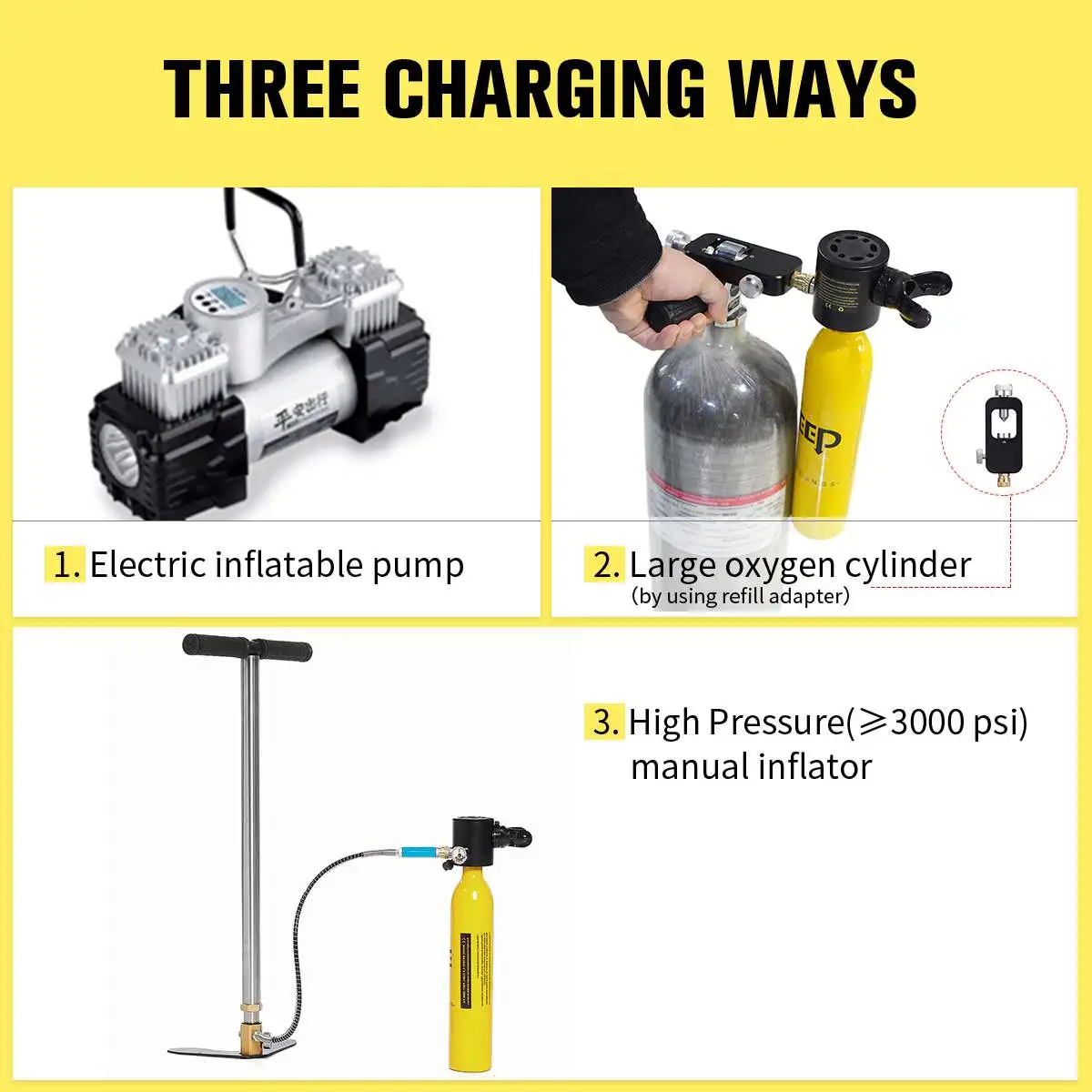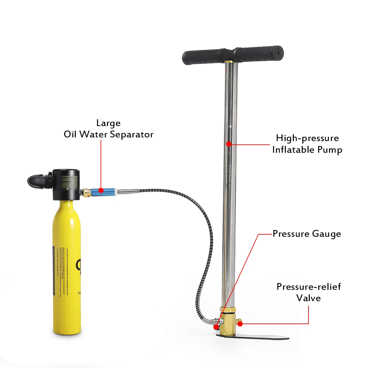 6. Максимальное давление наполнения этого продукта составляет 3000PSI, и он не может использовать заполненный этот газ с содержанием кислорода более 40%. Пожалуйста, используйте чистый и сухой сжатый воздух, не подвергайте воздействию продуктов выше 160 градусов Цельсия и не открывайте огонь.
