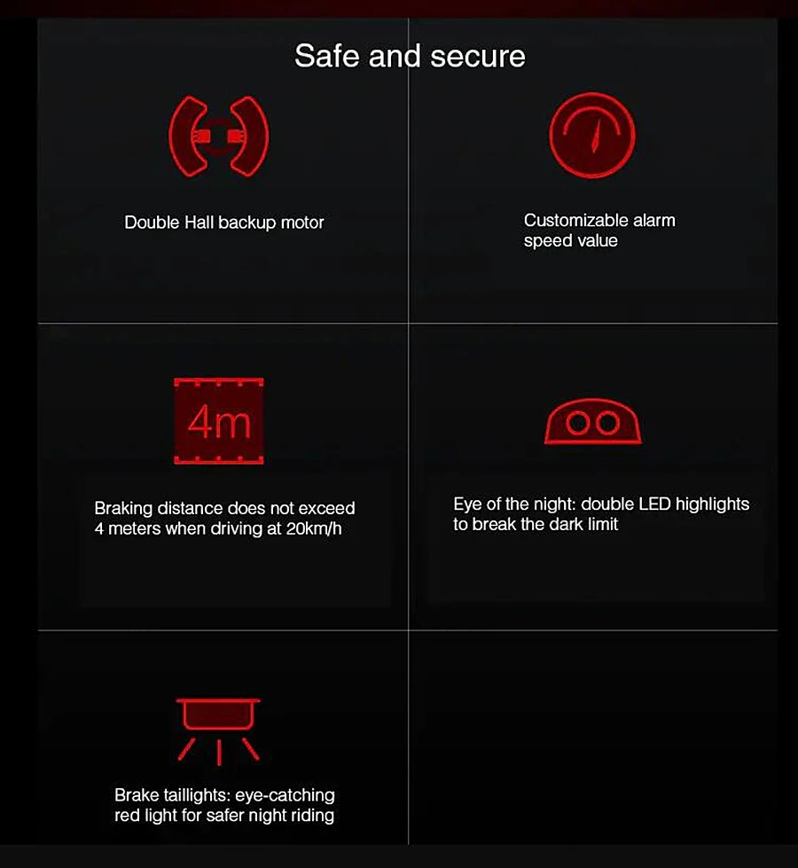 Двигатель мощностью 1800 Вт обеспечивает максимальную скорость 45 км/ч (безопасная скорость 20 км/ч) и максимальный градиент на 25 градусов.