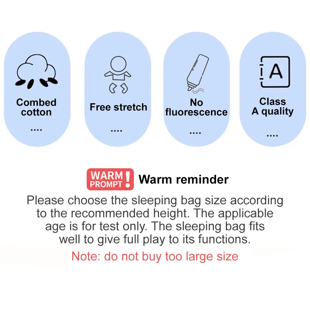 5. Толщина может быть выбрана: спальный мешок имеет три толщины, #1 подходит для 22-30 ℃, #2 подходит для 15-23 ℃, #3 подходит для 0-15 ℃, и хорошо сопровождать ребенка во все сезоны.