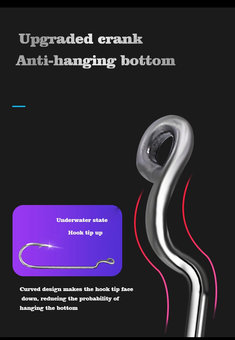 Изогнутая конструкция делает кончик крюка лицевой стороной вниз, уменьшая вероятность подвешивания дна