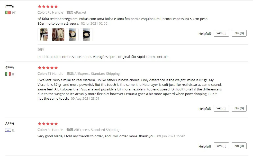 Отлично! Очень похожи на настоящие Viscaria, в отличие от других китайских клонов. Только разница в весе, мой 82 гр. Мой вес 87 гр, и более мощный. Но на ощупь то же самое. Слой Koto мягкий, как и настоящая видимость, такой же звук, такой же вид. Немного медленнее, чем у Viscaria, и, возможно, немного более гибкий в верхней скорости. Трудно сказать, является ли разница из-за веса или на самом деле более гибкой; Однако Lemuria идет немного выше, когда powerlooping. Но он имеет такое же прикосновение.