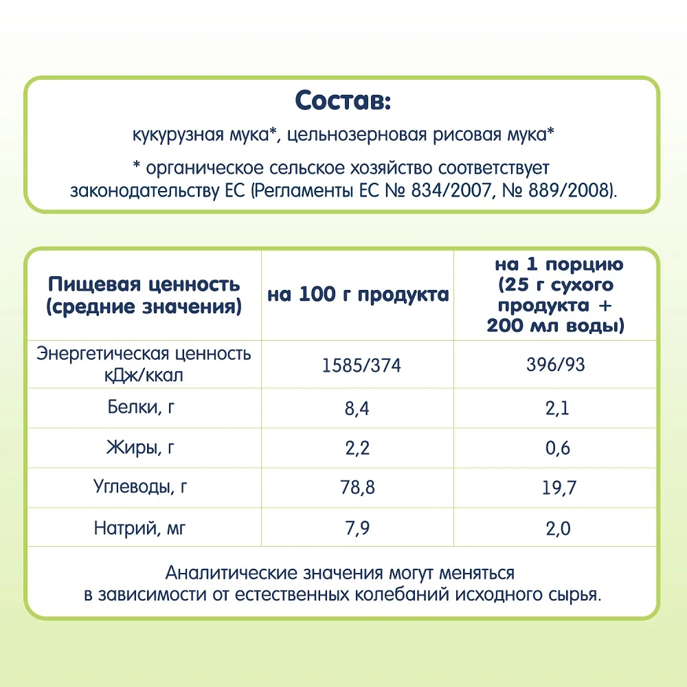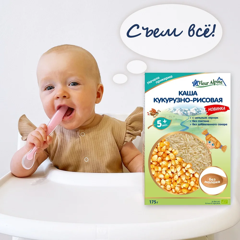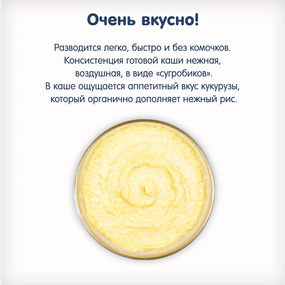 Corn-rice porridge is suitable for the beginning of complementary feed. Divorced easily, quickly and without lumps. A gentle, airy consistency of the finished porridge in the form of "soubolikov" resembles the snow, which lies on the surface with small lush uneven. In the porridge there is an appetizing taste of corn, which organically complements the delicate rice.