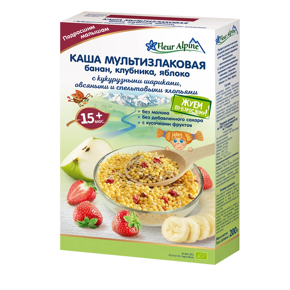 Каша мультизлаковая БАНАН, КЛУБНИКА, ЯБЛОКО с кукурузными шариками, овсяными и спельтовыми хлопьями понравится малышам и детям постарше: