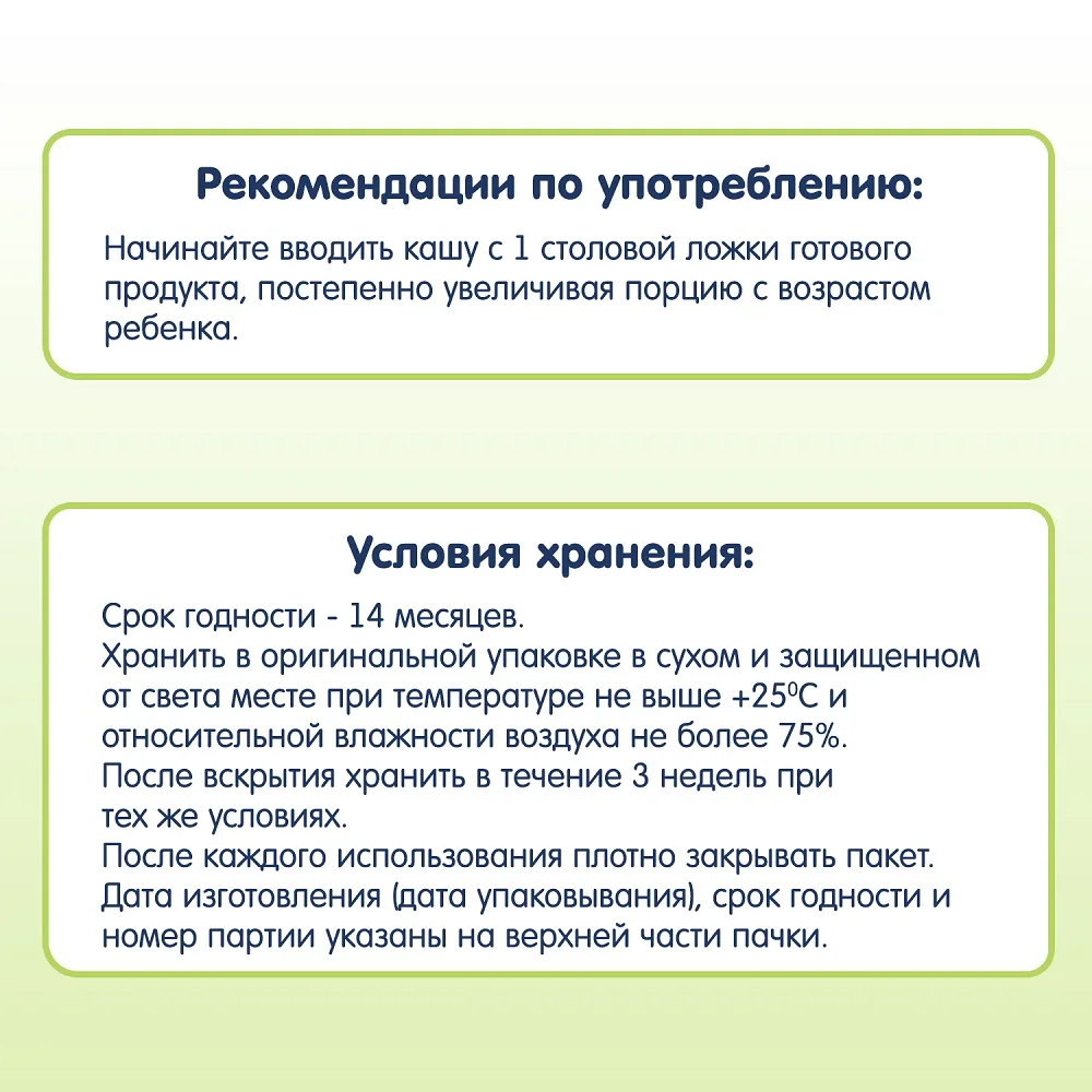 ВАЖНО: может содержать следы молока и орехов. Не варить. Готовьте кашу непосредственно перед кормлением. При вводе новых продуктов в рацион ребенка требуется консультация педиатра.