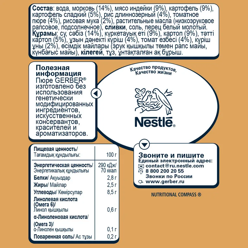 В состав пюре входят Омега 3 и омега 6. Произведено без использования генно-модифицированных ингредиентов, искусственных консервантов, красителей и ароматизаторов.