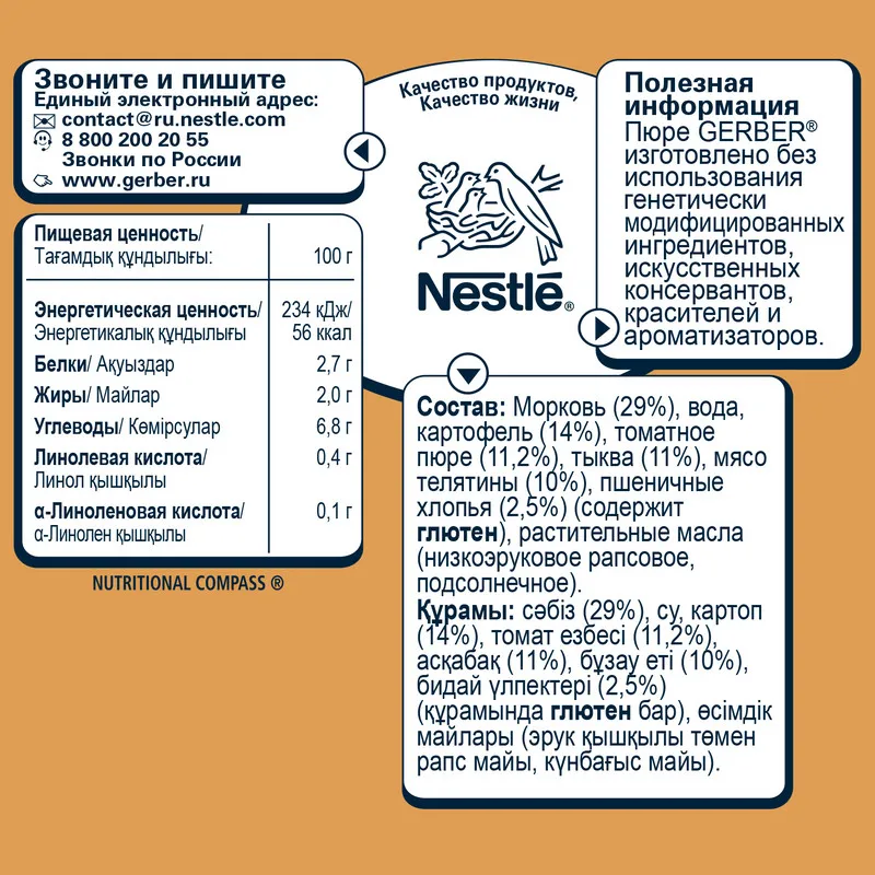 В состав пюре входят Омега 3 и омега 6. Произведено без использования генно-модифицированных ингредиентов, искусственных консервантов, красителей и ароматизаторов.