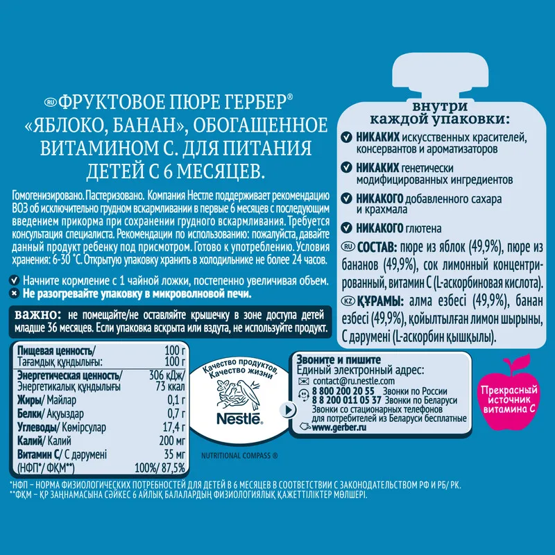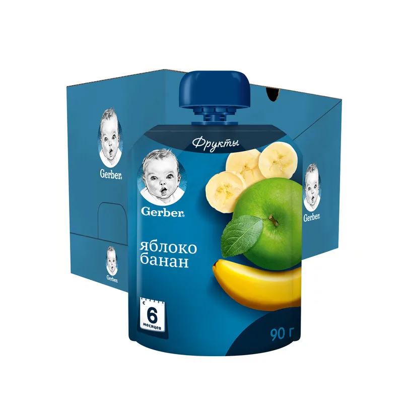 Гербер фруктовое пюре яблоко и банан от 6 месяцев 90 г мешочек