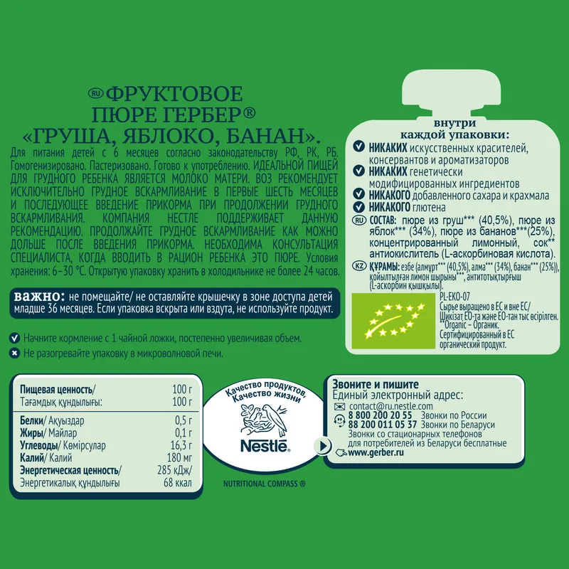 Гербер Органическая груша, яблоко, банан-это преимущество и вкус трех фруктов в одном изысканном пюре. Это отборные фрукты, выращенные в соответствии с принципами органического земледелия под контролем специалистов компании. Это удобная и безопасная упаковка, которая помогает ребенку научиться есть самостоятельно. Пюре Гербер Органическая груша, яблоко, банан очень вкусное лакомство для вашего ребенка!