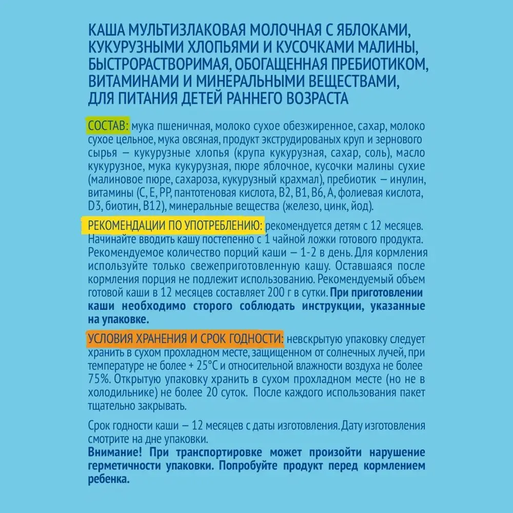 Состав: Мука пшеничная, молоко сухое обезжиренное, сахар, молоко сухое цельное, мука овсяная, продукт экструдированных круп и зернового сырья - кукурузные хлопья (крупа кукурузная, сахар, соль), масло кукурузное, мука кукурузная, пюре яблочное, кусочки малины сухие (малиновое пюре, сахароза, кукурузный крахмал), пребиотик – инулин, витамины (С, Е, РР, пантотеновая кислота, В2, В1, В6, А, фолиевая кислота, D3, биотин, В12), минеральные вещества (железо, цинк, йод)