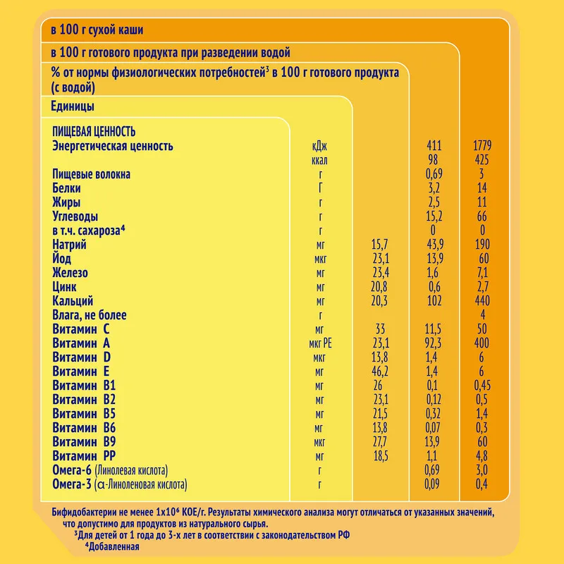 Каша приготовлена по специальной технологии мягкого разделения злаков. Благодаря этому в изделии присутствует натуральный сладкий вкус, каша лучше впитывается и обладает повышенной пищевой ценностью. Каша-полезная сбалансированная еда для здоровых детей. Обогащен пробиотиками-живыми бифидоактами BL. Они способствуют нормализации пищеварения, росту здоровой микрофлоры и повышению иммунитета, что очень важно во время введения дополнительного корма. Каша содержит комплекс витаминов и минералов железа + для здорового роста и развития.