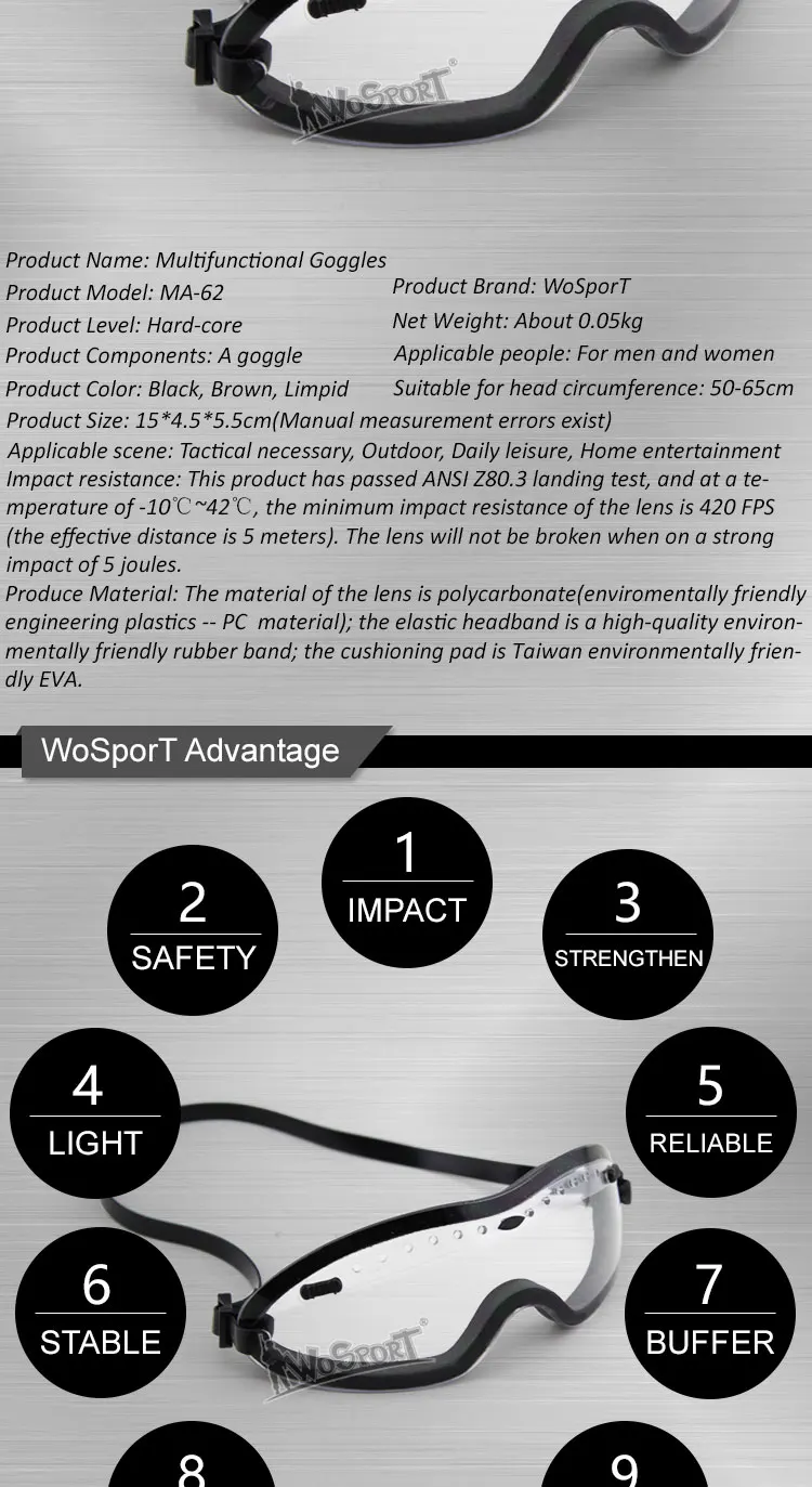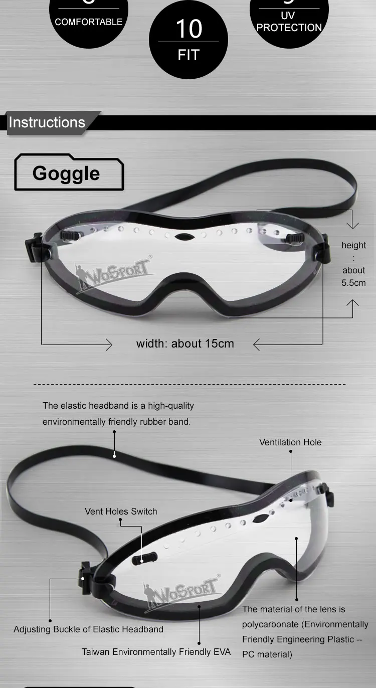 Материал: Материал линз-поликарбонат (экологически чистый инженерный пластик-поликарбонат); Эластичная повязка на голову-высококачественная Экологически чистая Резиновая лента; Мягкая подкладка-Тайваньская Экологически чистая ЭВА.