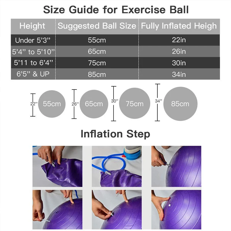 Универсальное Использование: не только отлично подходит для пилатеса, йога, спины и брюшной тренировки и гимнастики беременности или сотни упражнений с низким воздействием, но также может использоваться в качестве офисного шарового стула для улучшения осанки и снятия боли в спине. Доступно в 3 размерах (от 55 см до 75 см) и разных цветах для идеального образа и посадки.