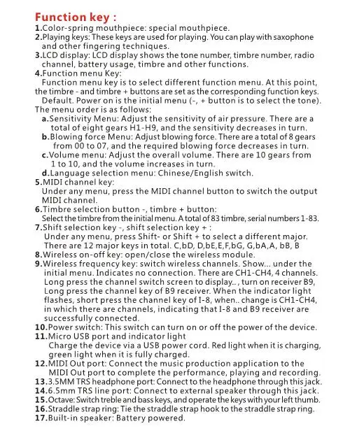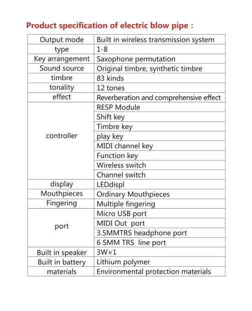 Это простой и простой в обучении инструмент. Он может производить красивые звуки с легким дыханием и игрой. Он имеет 83 встроенных высококачественных тонов, включая саксофон, кларнет, одиночный бобин, скрипку...