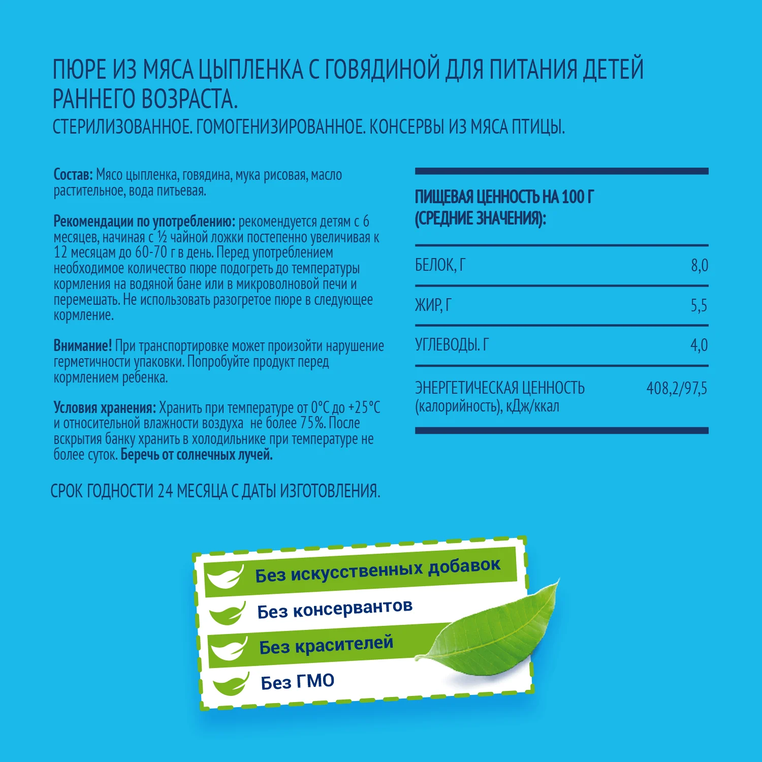 Chicken puree with beef for early childhood. Стерилизован. Гомогенизированное. Canned poultry meat. Meat puree is an important product in the daily diet of the child for 6 months, a source of protein and indispensable amino acids necessary for the construction of the child's body!