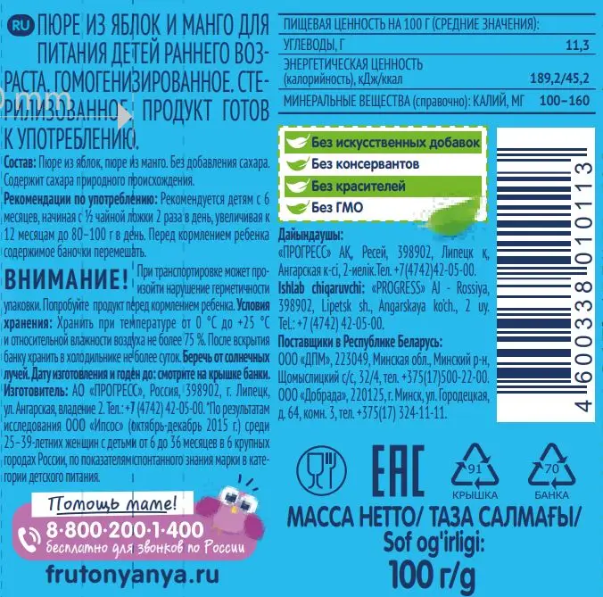Пюре ФрутоНяня яблоко, манго с 6 мес., 100г*12 шт.